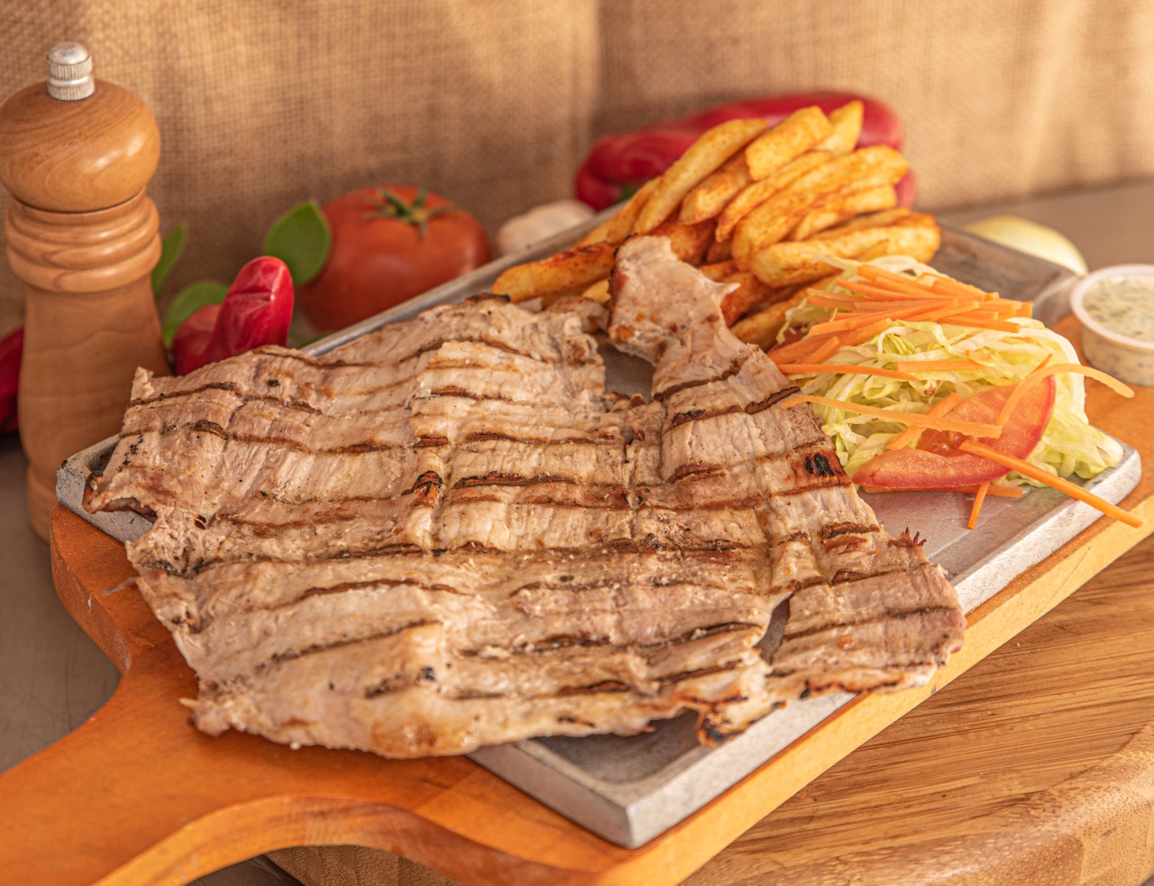Lomo de cerdo asado a la parrilla, acompañada de papa francesa a la paprika, ensalada y salsas especiales de la casa.