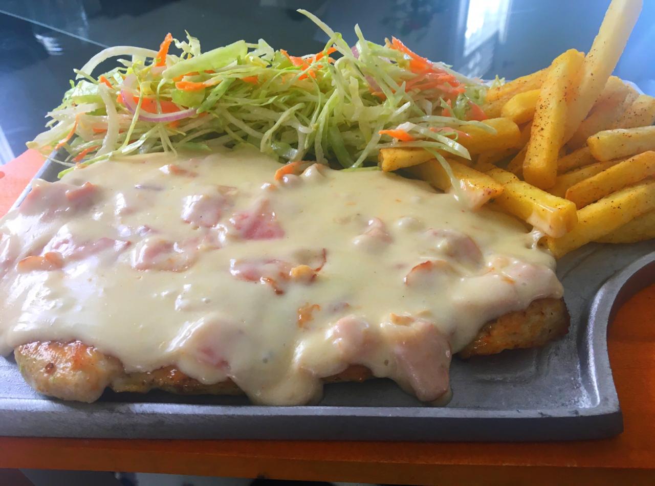 Pechuga de 200 g, asada a la parrilla, bañada con queso fundido y tocineta, acompañado de papa francesa a la paprika y ensalada.