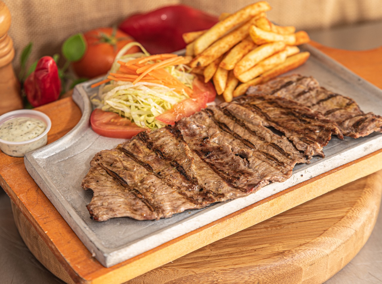 Lomo de asado a la parrilla, acompañada de papa francesa a la paprika, ensalada y salsas especiales de la casa.