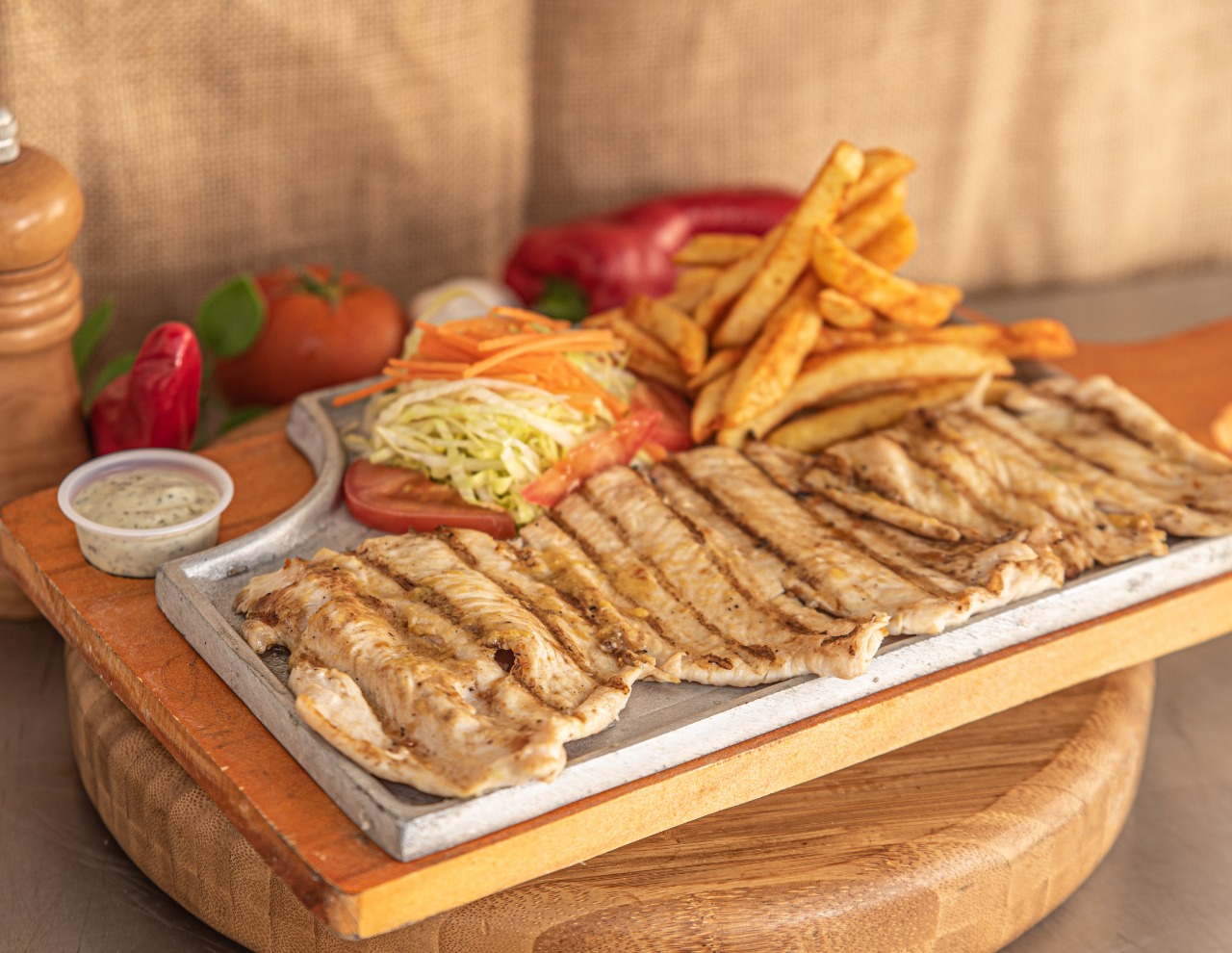 Pechuga grill, acompañada de papa francesa a la paprika, ensalada y salsas especiales de la casa.