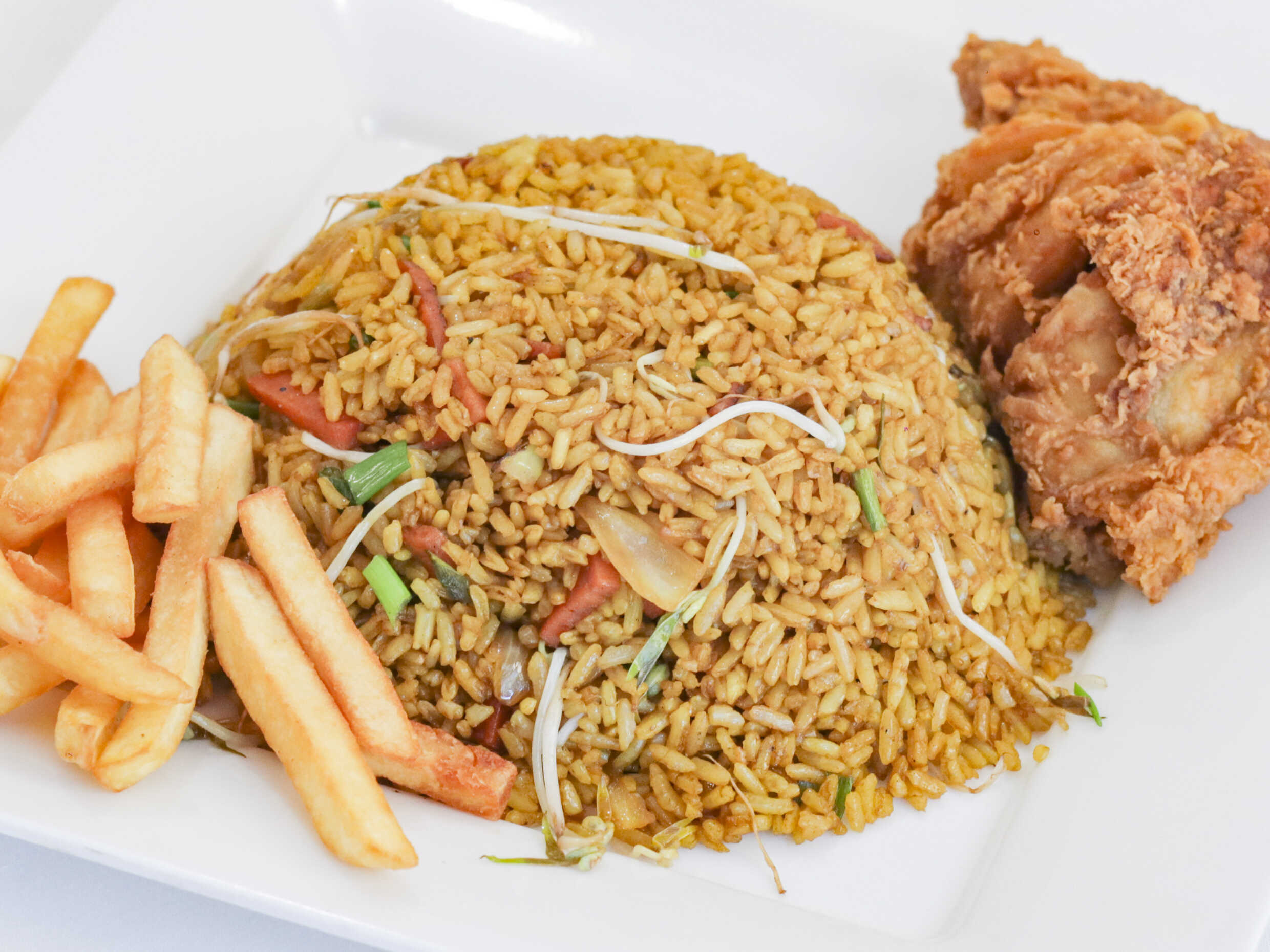 Arroz chino de Jamón, acompañado de pollo broaster, imagen de referencia