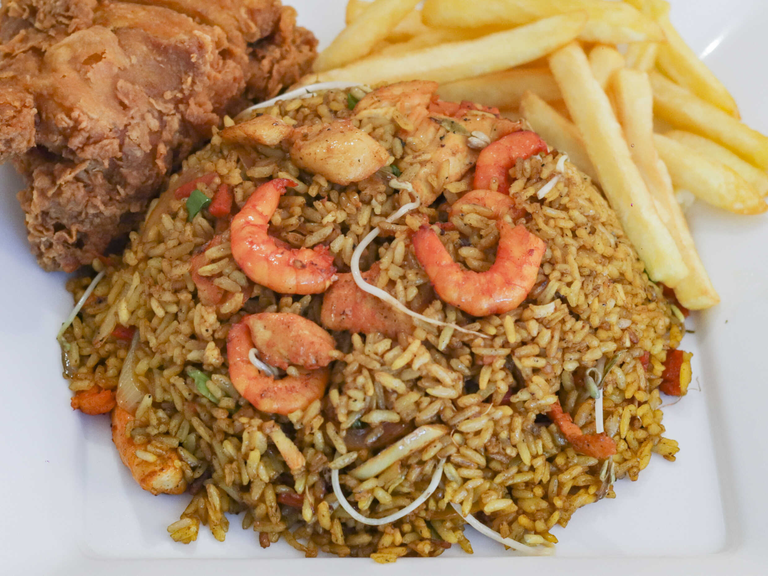 Arroz chino de Camarón, cerdo y pollo, acompañado de 1 pieza pollo broaster., imagen de referencia