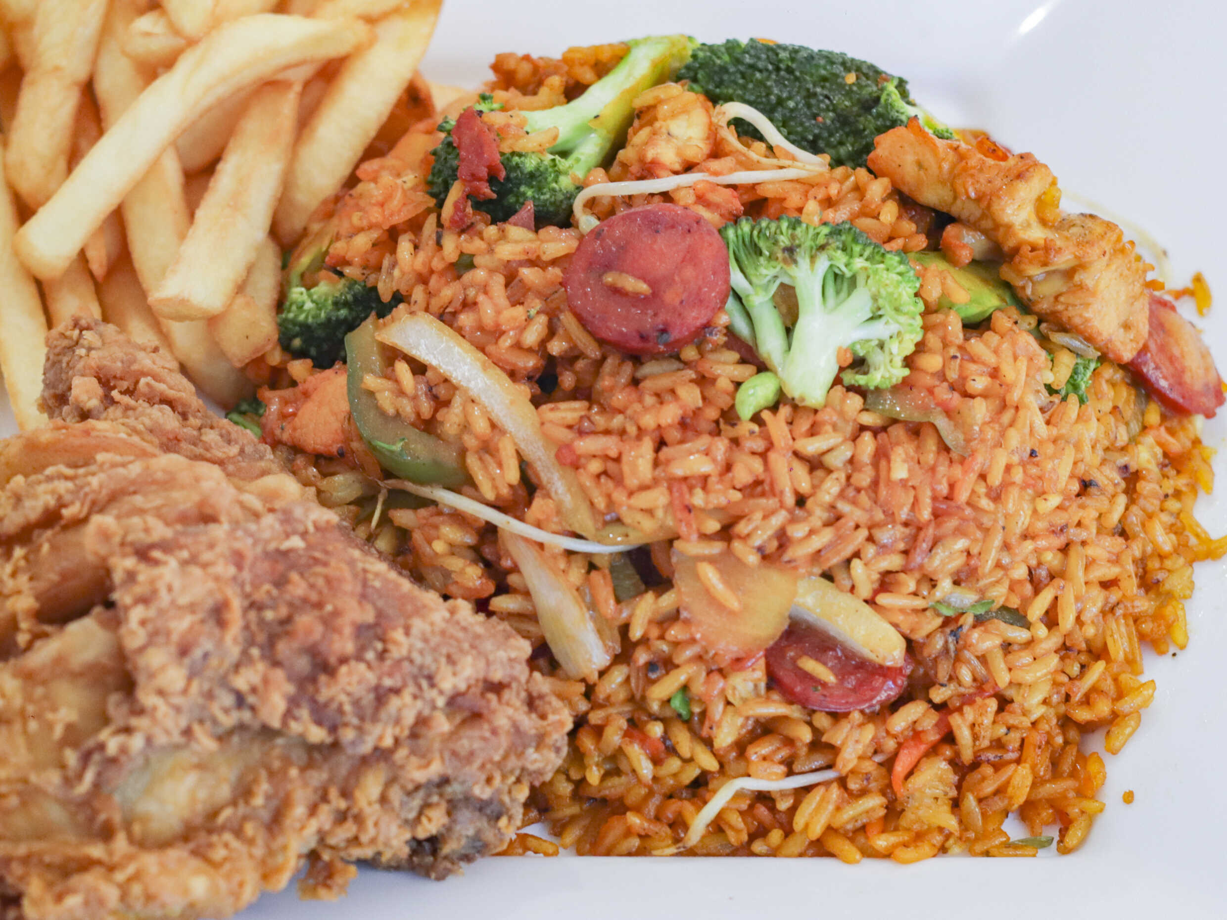 Arroz chino de Brócoli, pimentón, zanahoria, cerdo, pollo y chorizo, acompañado de pollo broaster (2 porciones de pollo), para 3 - 4 personas, imagen de referencia.