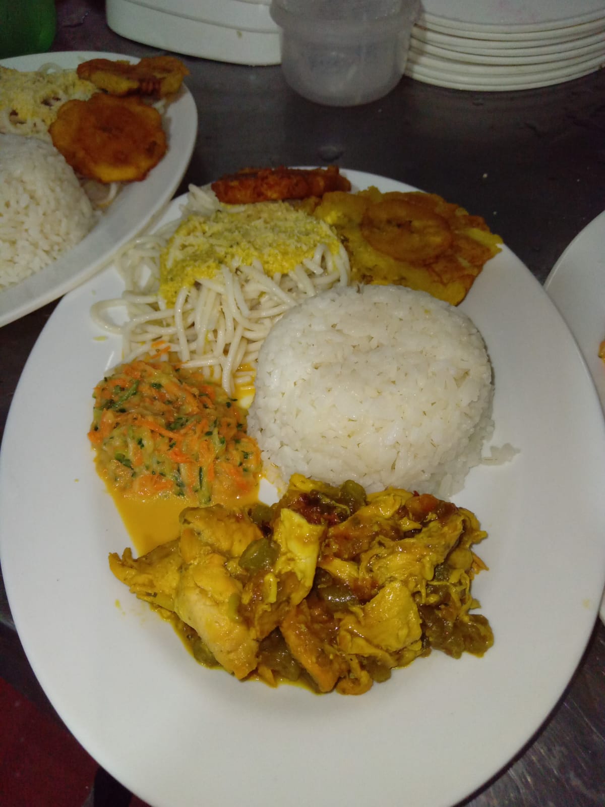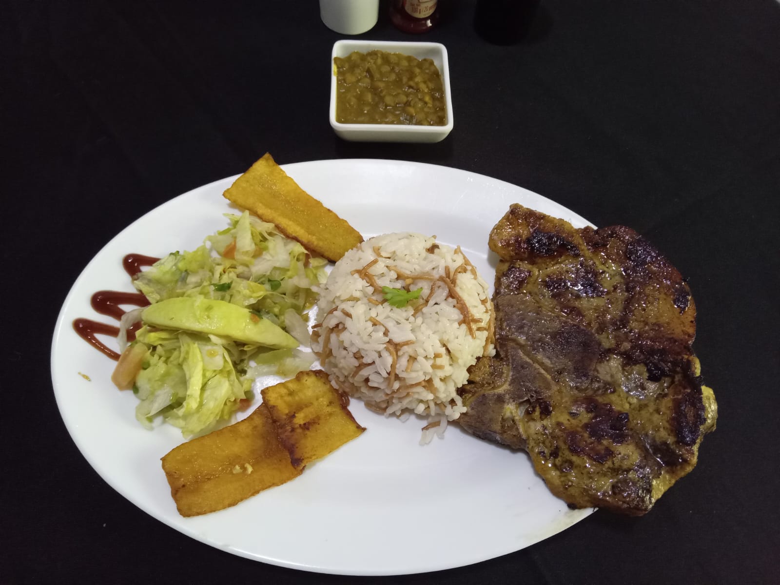 Arroz, ensalada, patacones o tajadas, sopa y jugo.