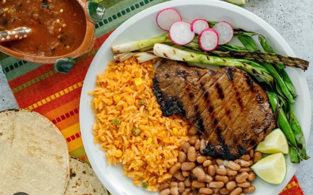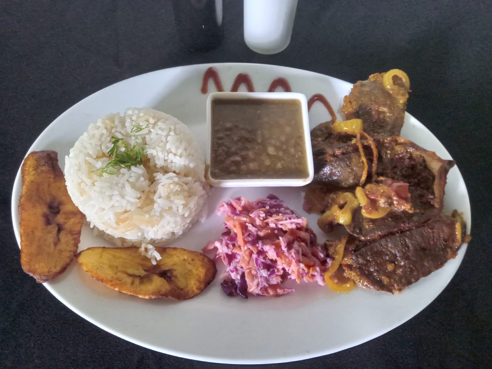 Arroz, ensalada, granos, patacones o tajadas, sopa y jugo.