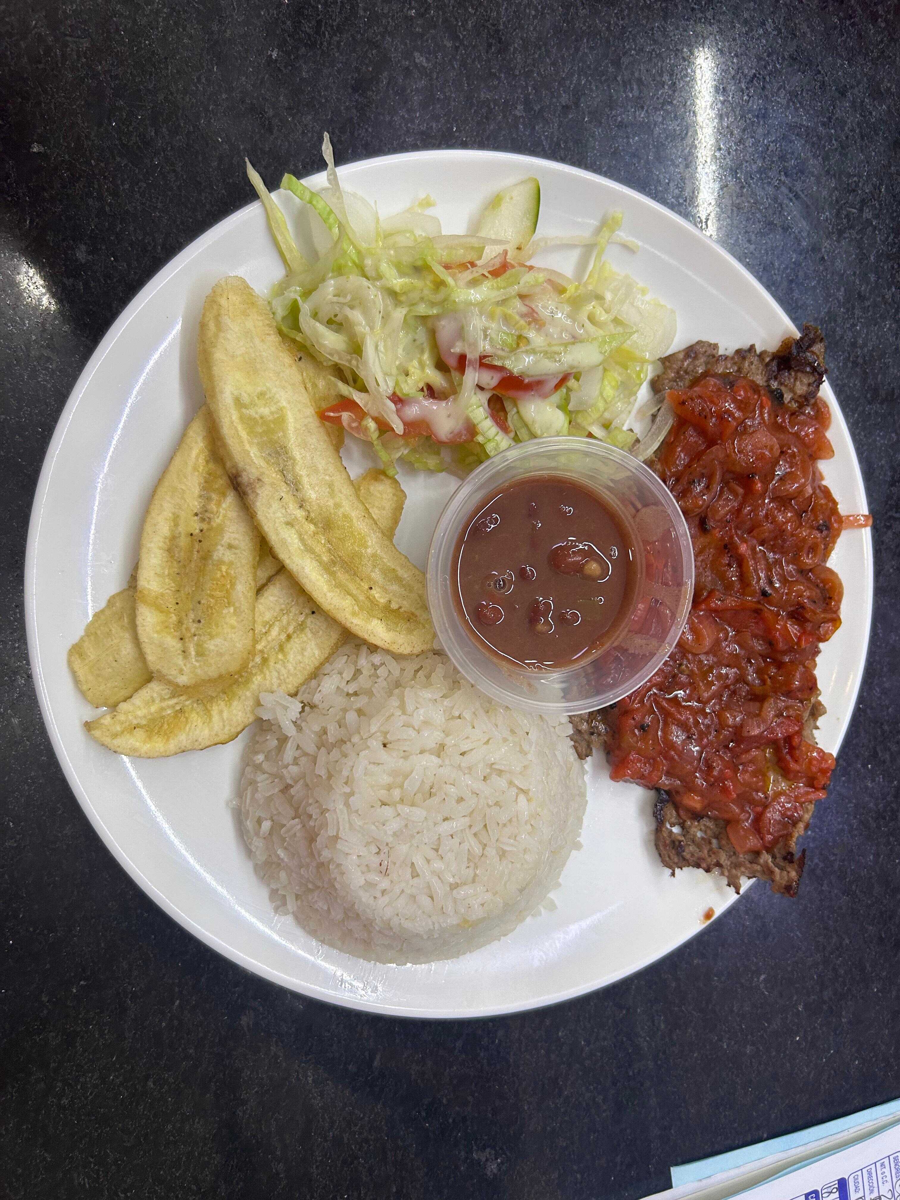 Plato ejecutivo, acompañado con arroz, sopa del día, granos, ensalada, tajadas y bebida.