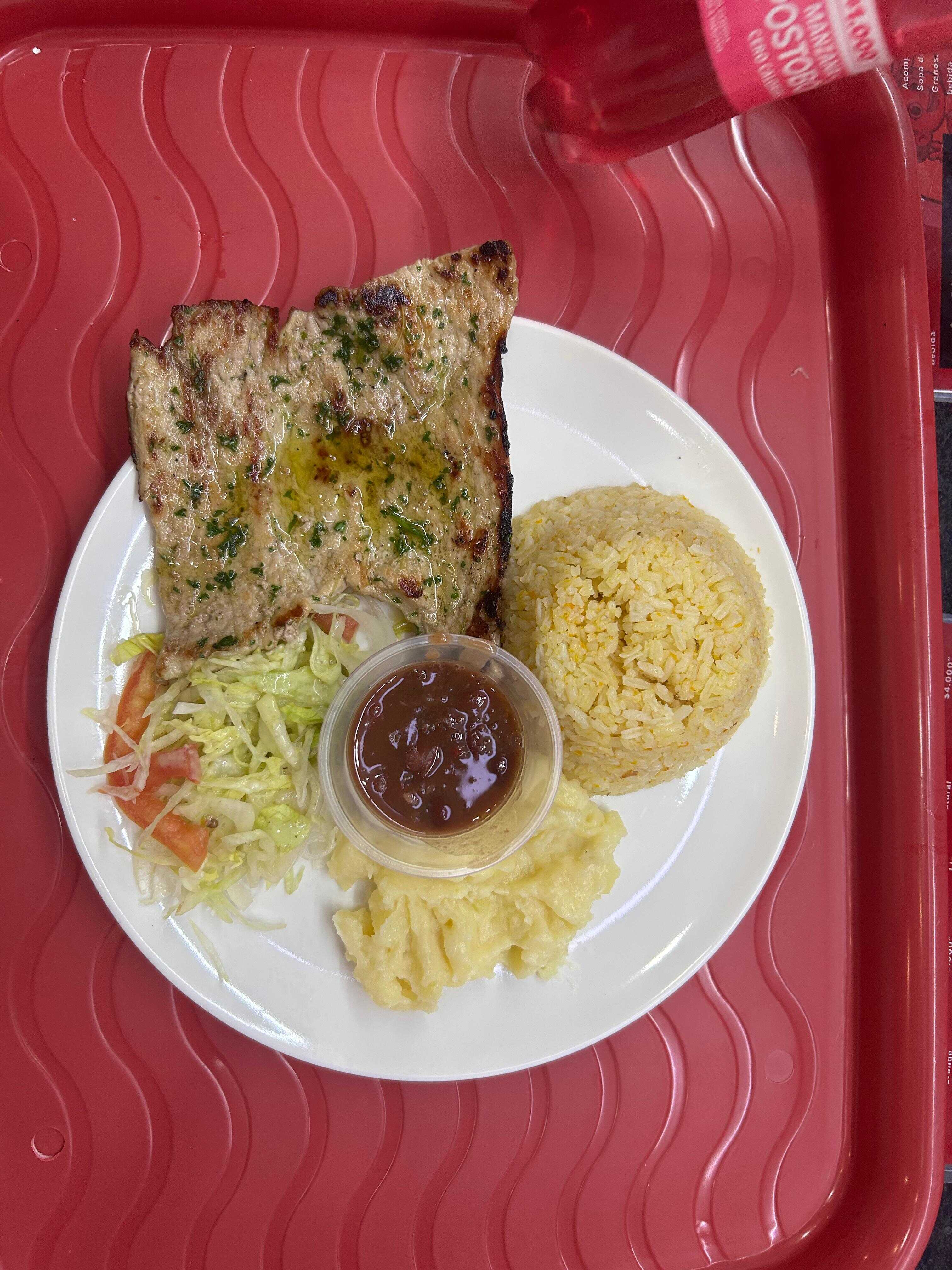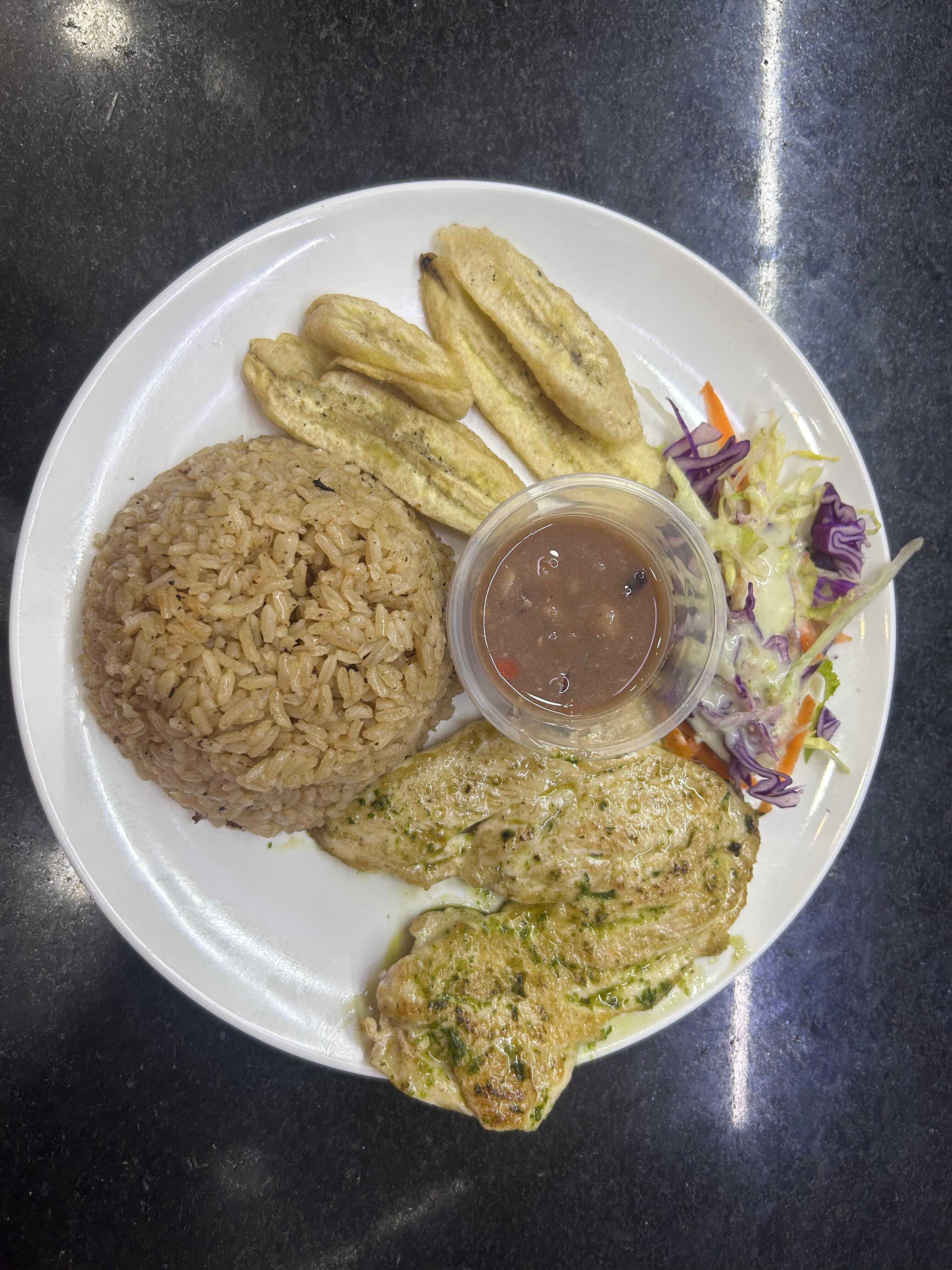 Plato ejecutivo con pechuga asada, acompañado con arroz, granos, ensalada, sopa del dia, tajadas y bebida