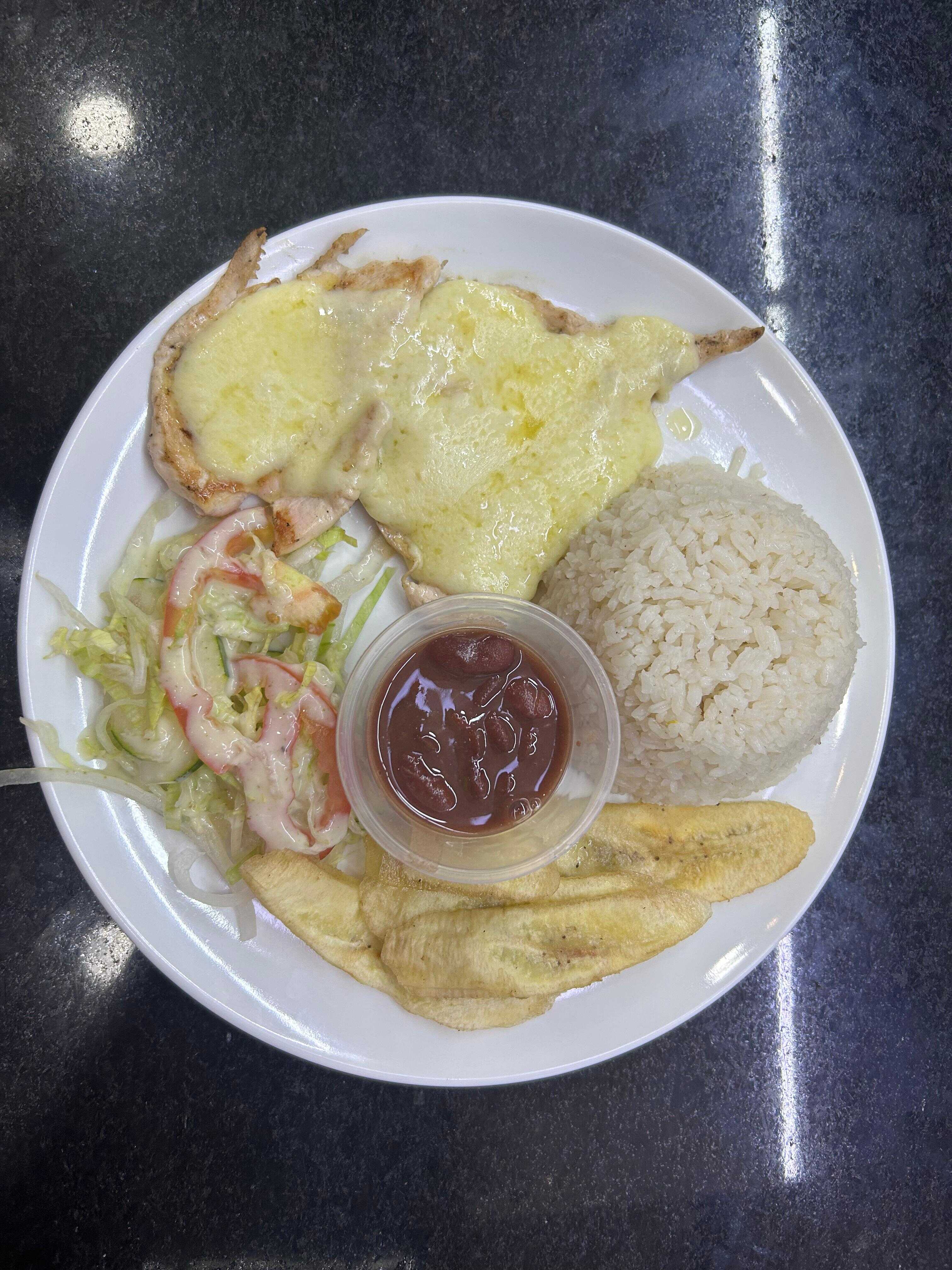 Plato ejecutivo con pechuga gratinada, Acompañado con arroz, sopa del dia, granos, ensalada, tajadas y bebida