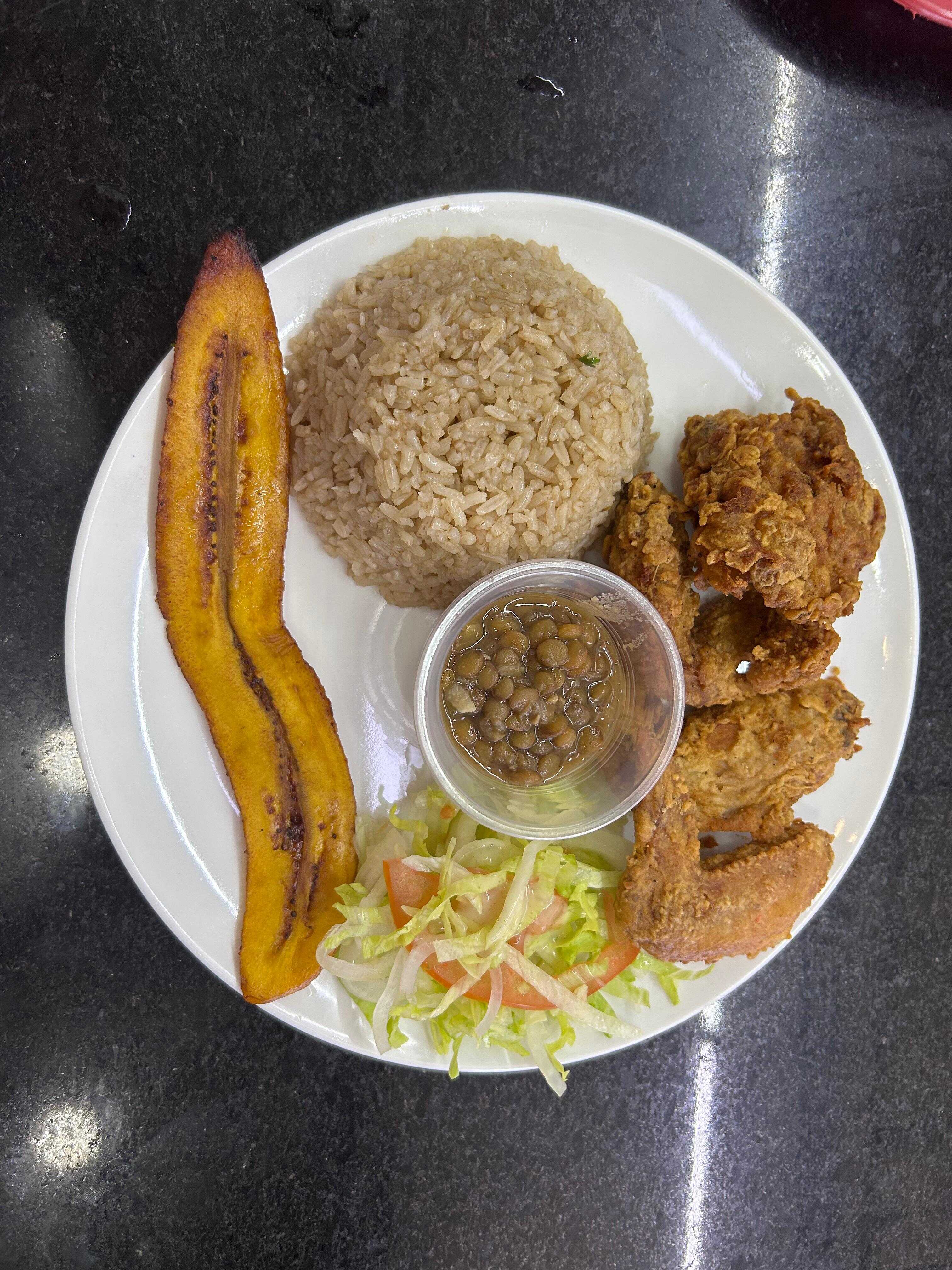 Plato ejecutivo con alitas apanadas, Acompañado con arroz, sopa del dia, granos, ensalada, tajadas y bebida