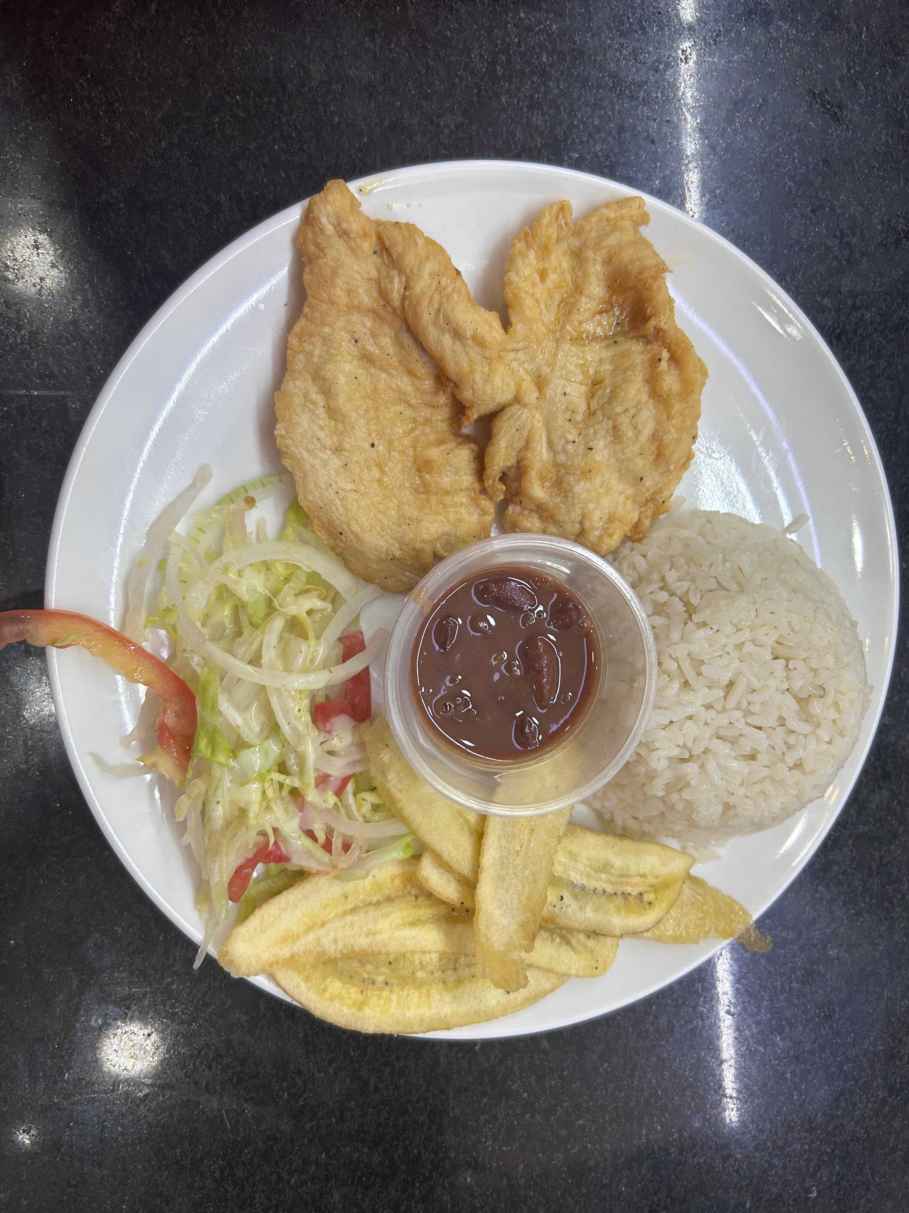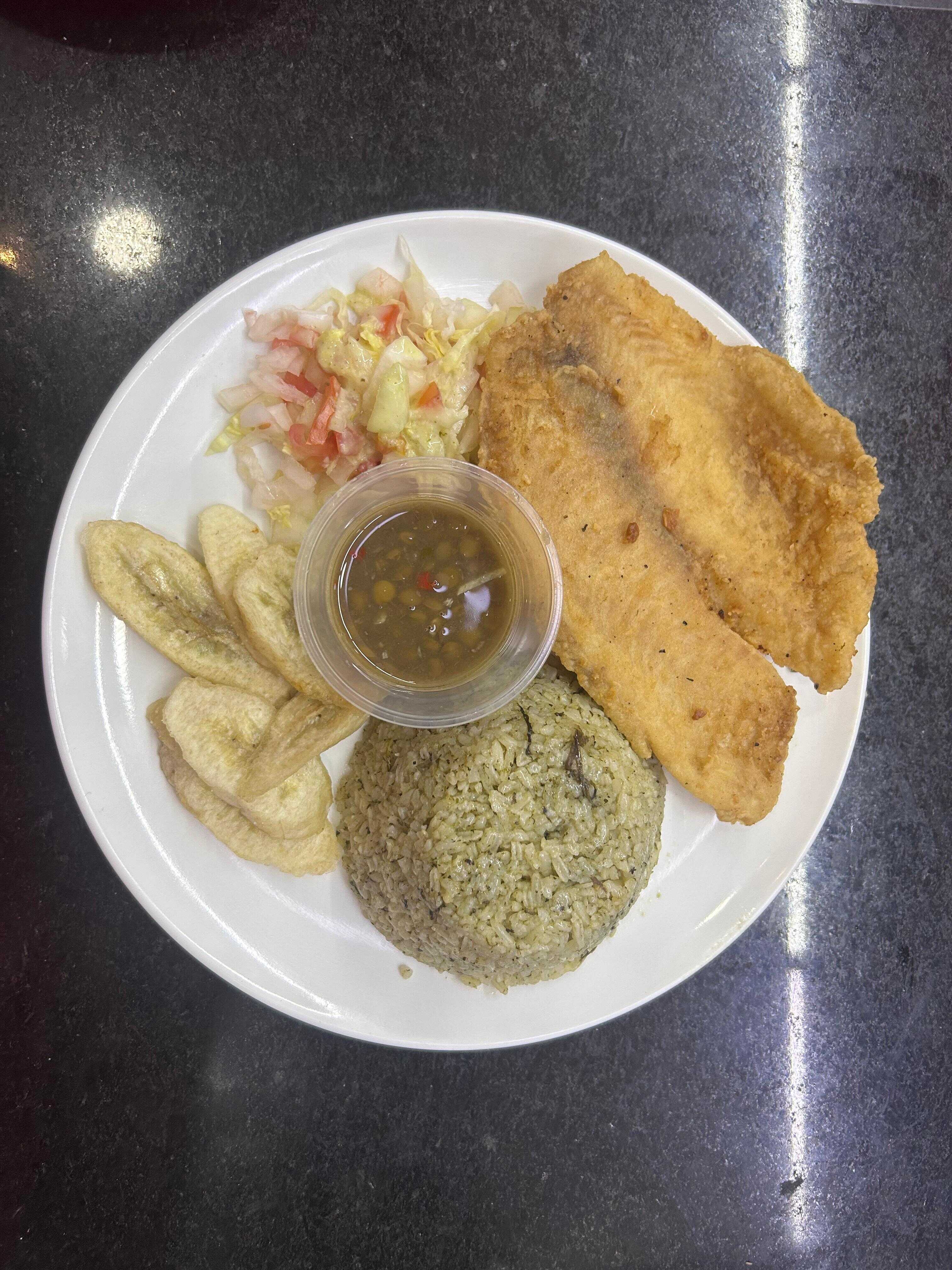 Plato ejecutivo con filete de tilapia, sopa del dia, arroz, tajadas, ensalada y bebida.