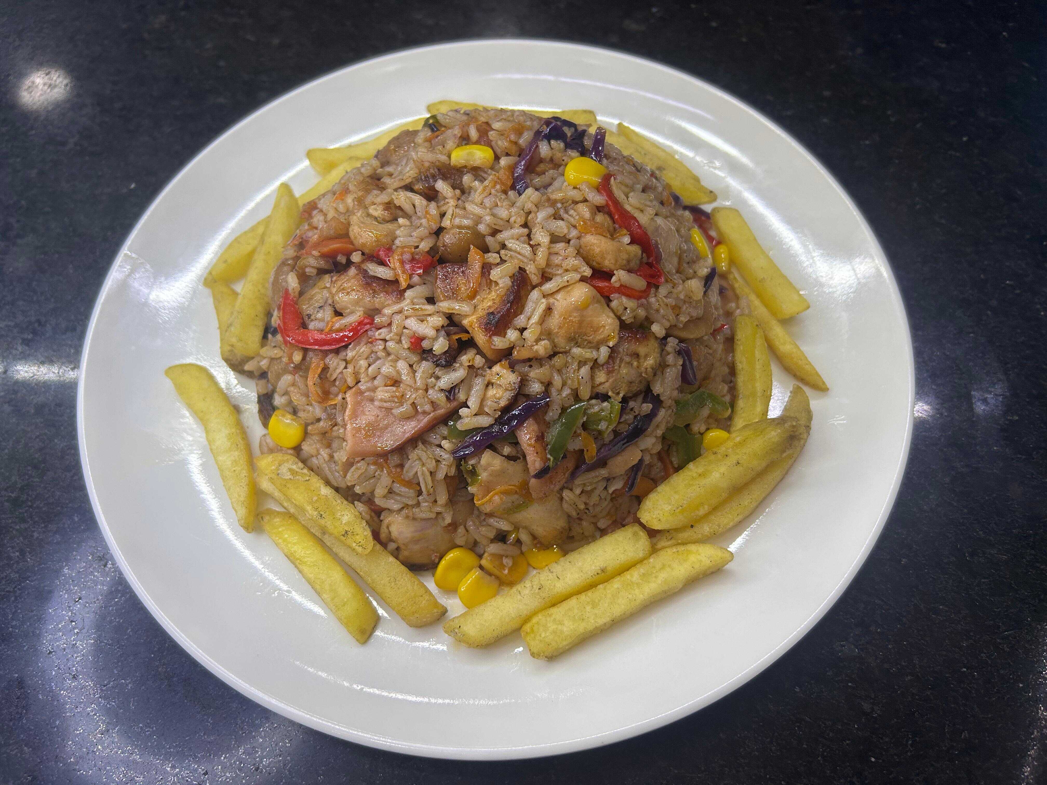 Arroz mixto tamaño personal, acompañado con papas a la francesas