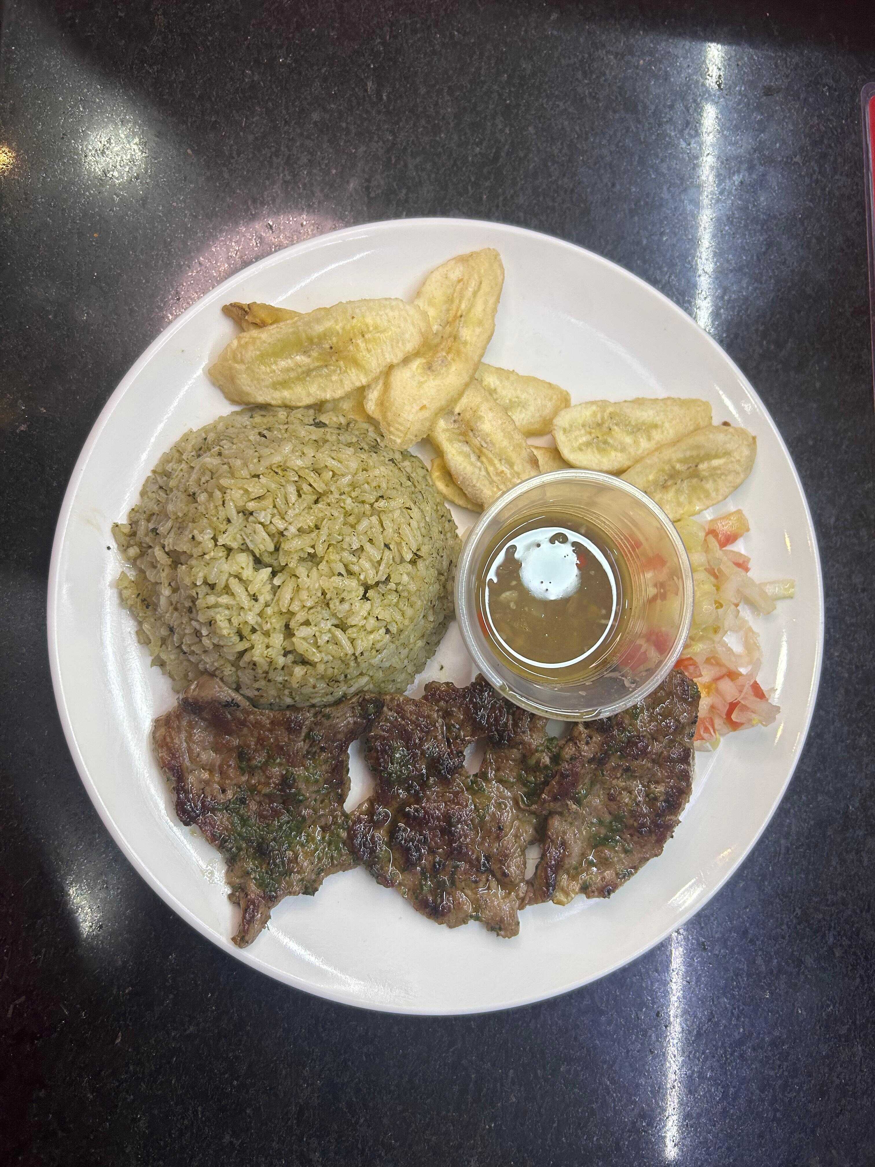 Plato ejecutivo con carne asada, Acompañado con arroz, sopa del dia, granos, ensalada, tajadas y bebida