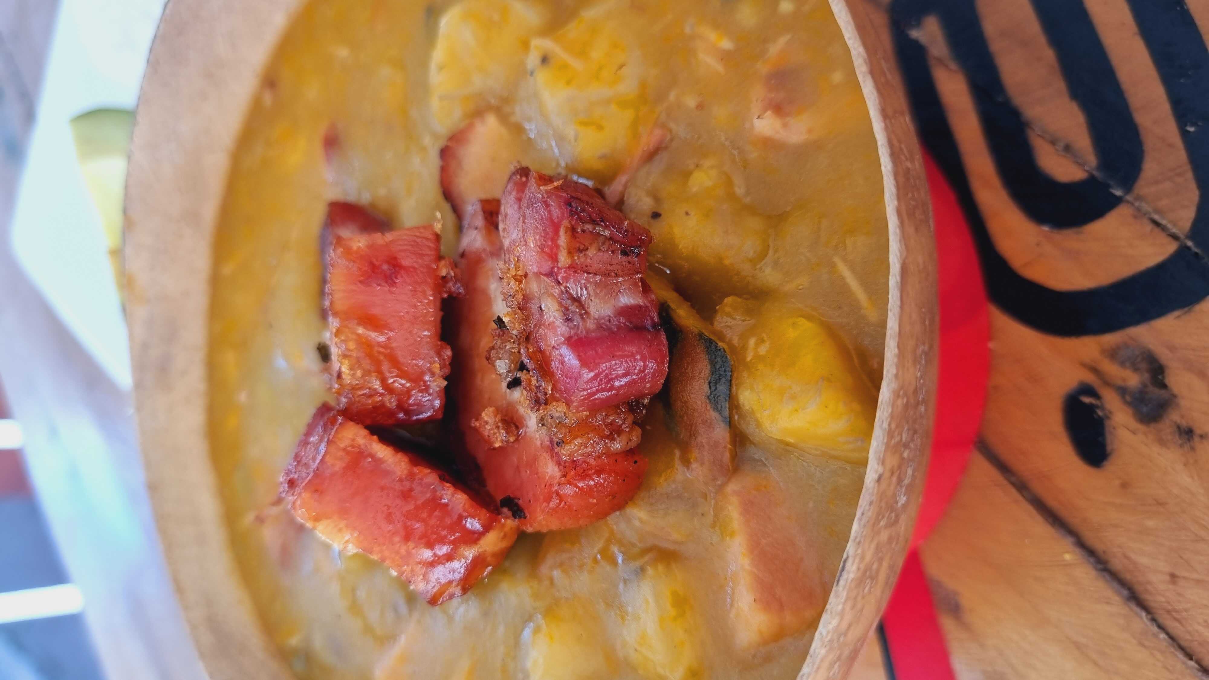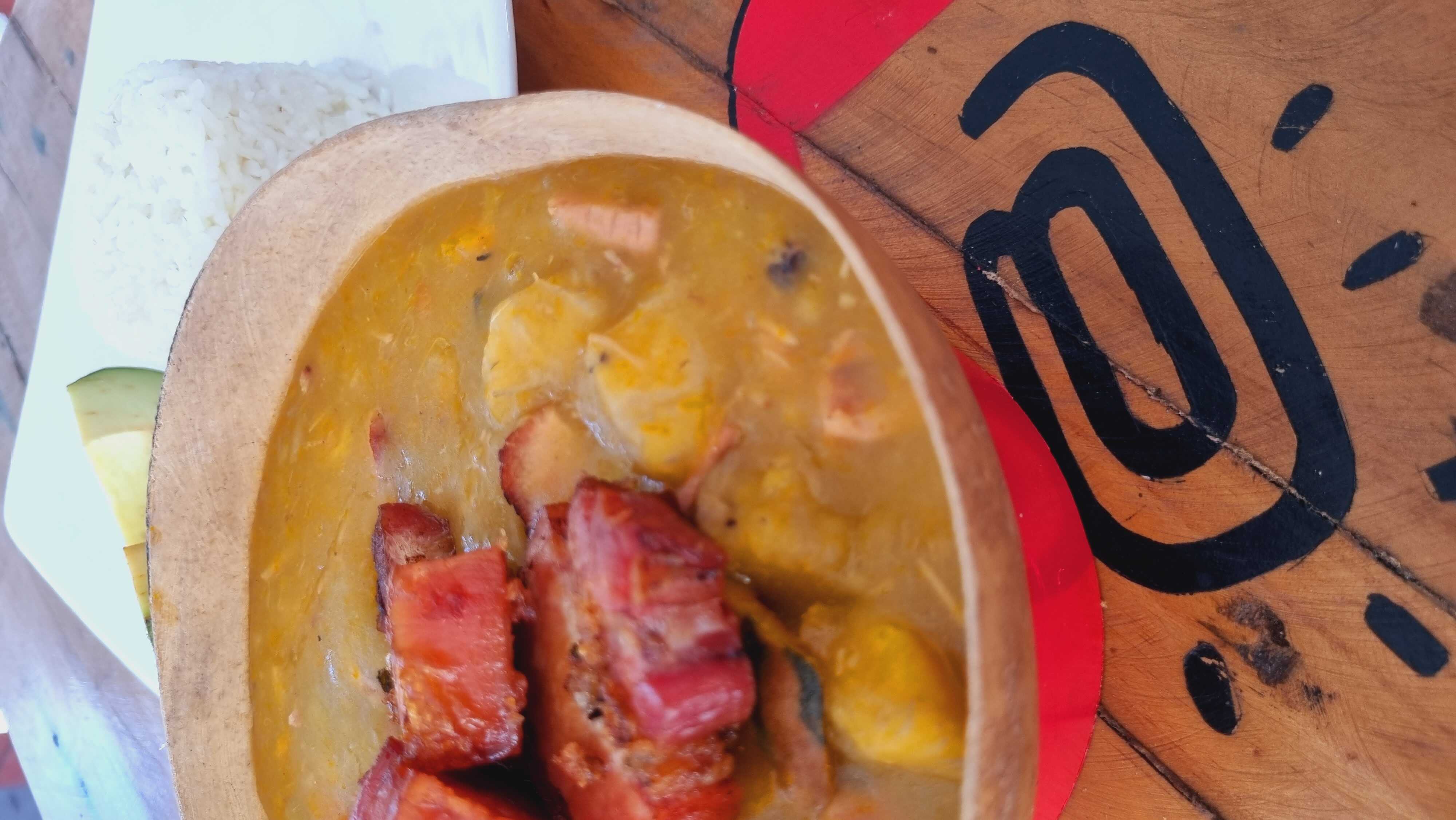 Sancocho de guandú verde de Sibarco con cerdo y chicharrones, arroz y aguacate, 1 litro.