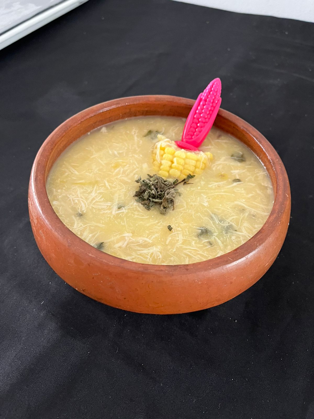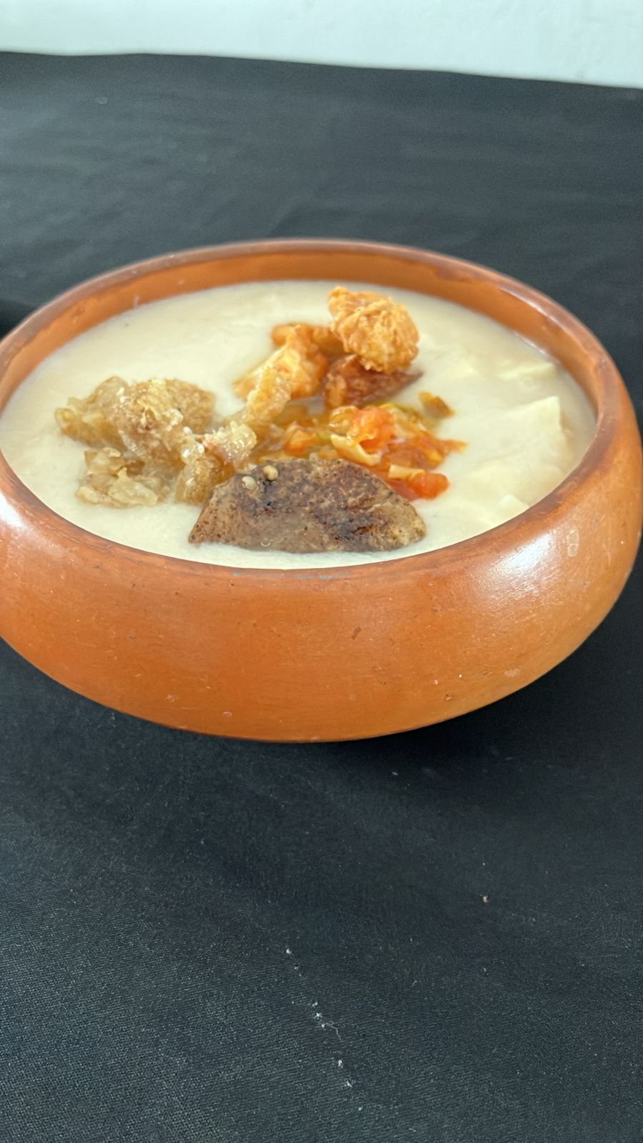 1 Litro de mote de queso al estilo de Sincé, Sucre. Incluye arroz, hogao, aguacate, berenjena al ajillo y chicharrones.