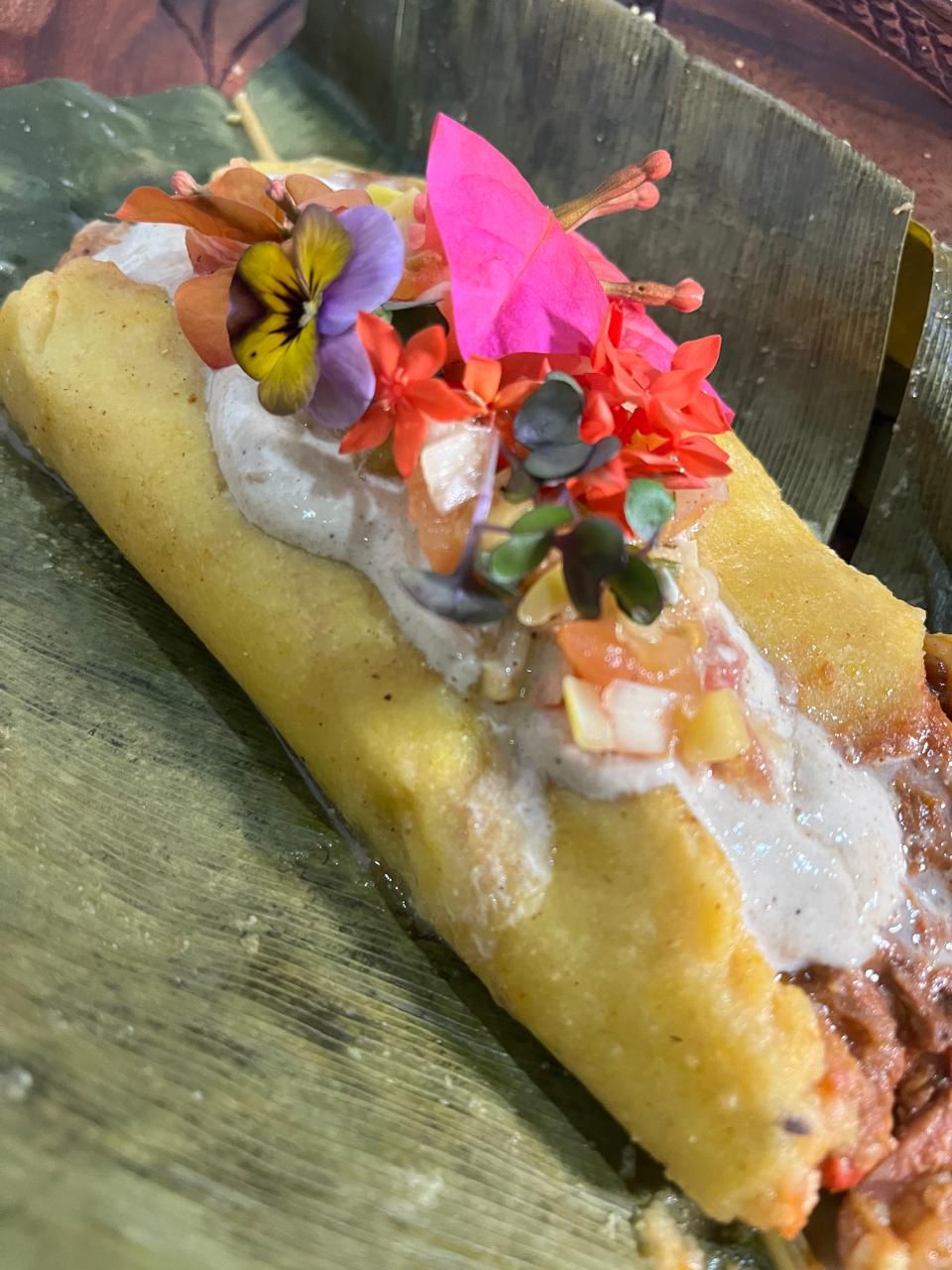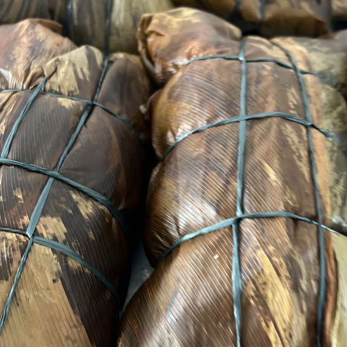 Hallaca artesanal elaborada con masa de maíz, rellena con guiso criollo de pollo y cerdo, envuelta en hoja de plátano y cocinada al vapor. Un sabor lleno de tradición y hogar.