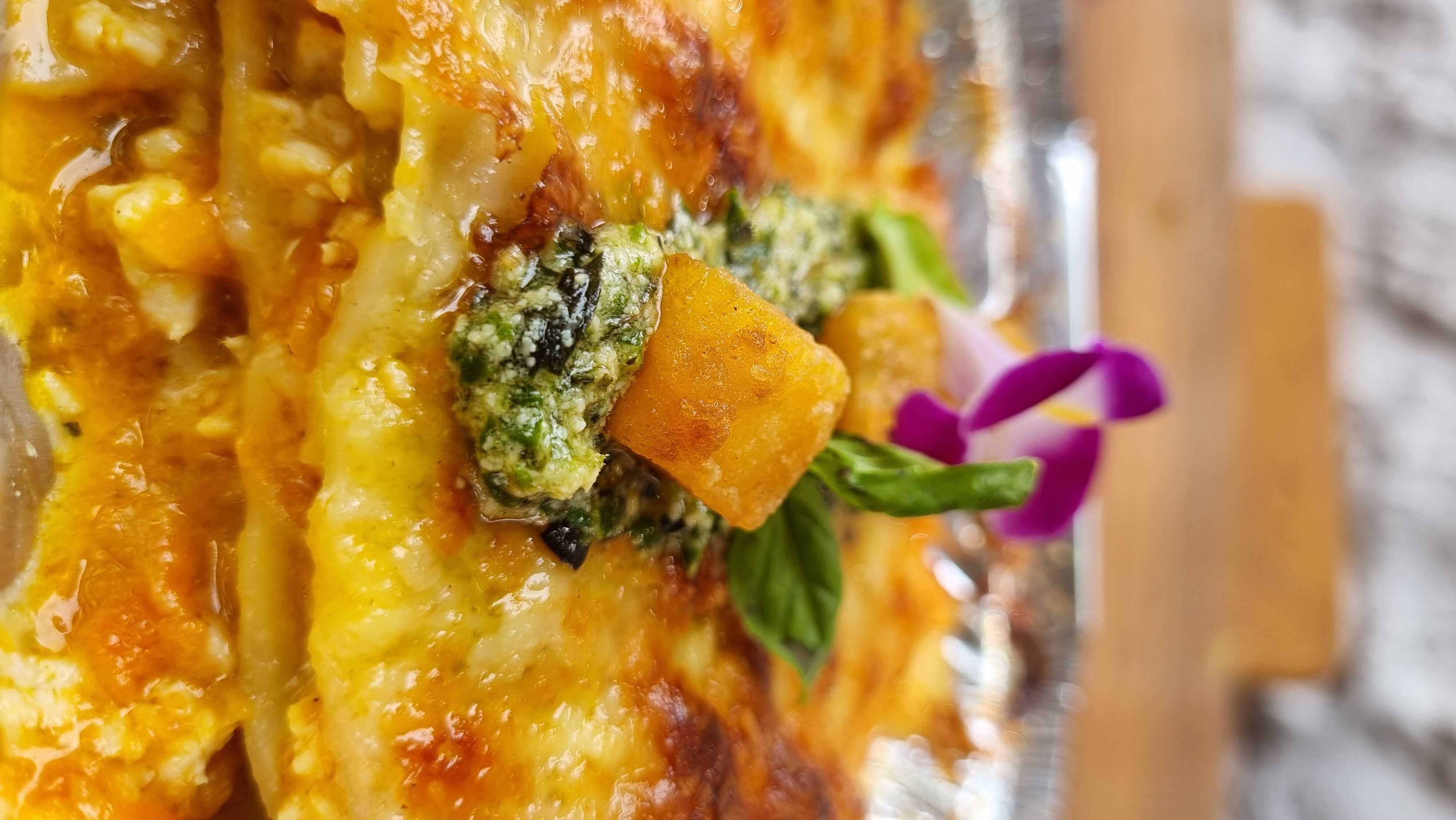 Lasagna de pollo criolla con bechamel de coco y salsa criolla.