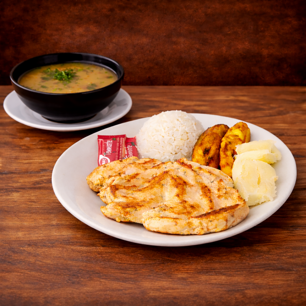 170 g de pechuga a la plancha, arroz, yuca cocida, tajada y suero costeño +Sopa 16 oz
