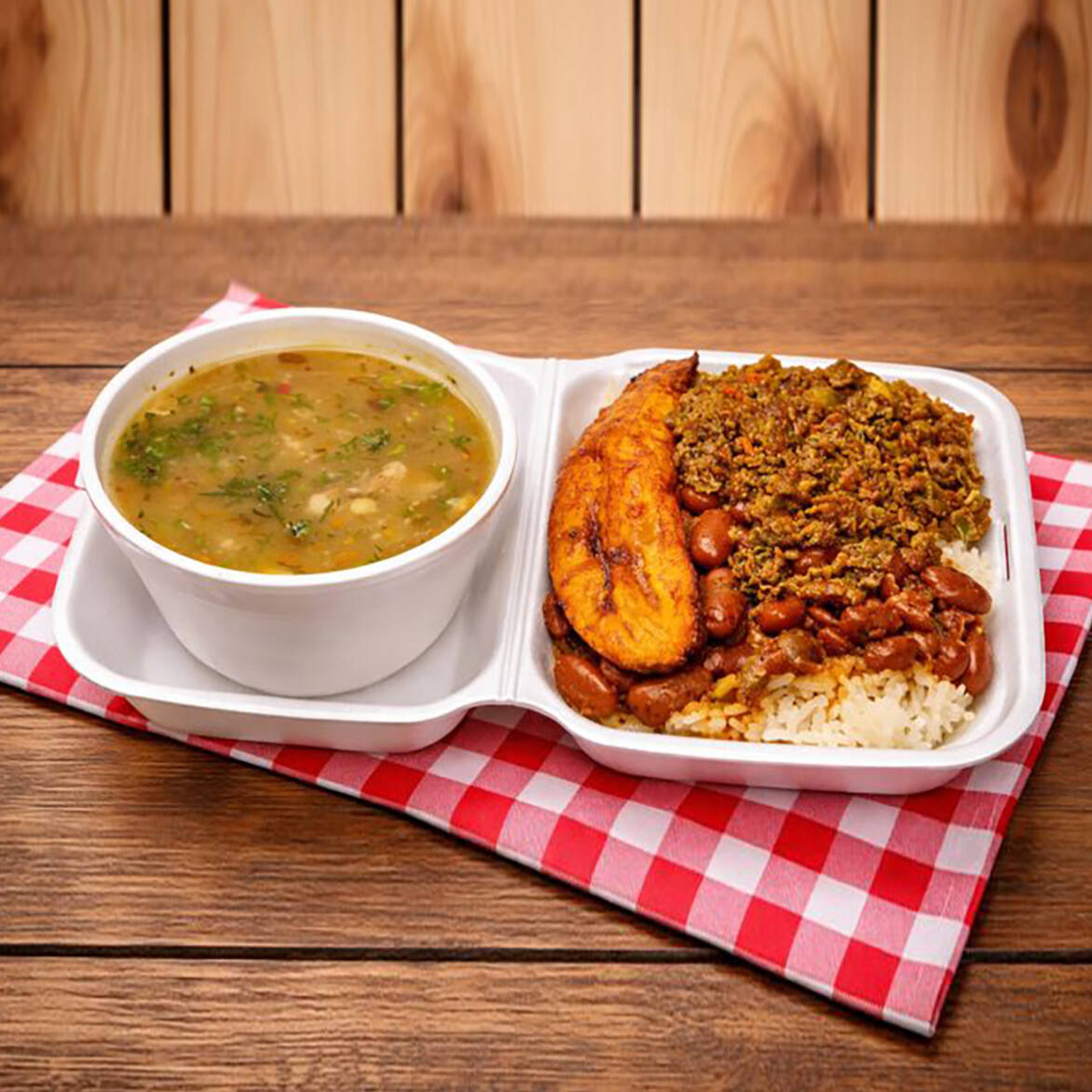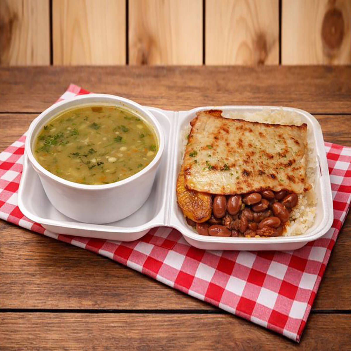 Incluye arroz, granos y carne molida, servido en porta hamburguesa. Acompañado de sopa de 16 oz.