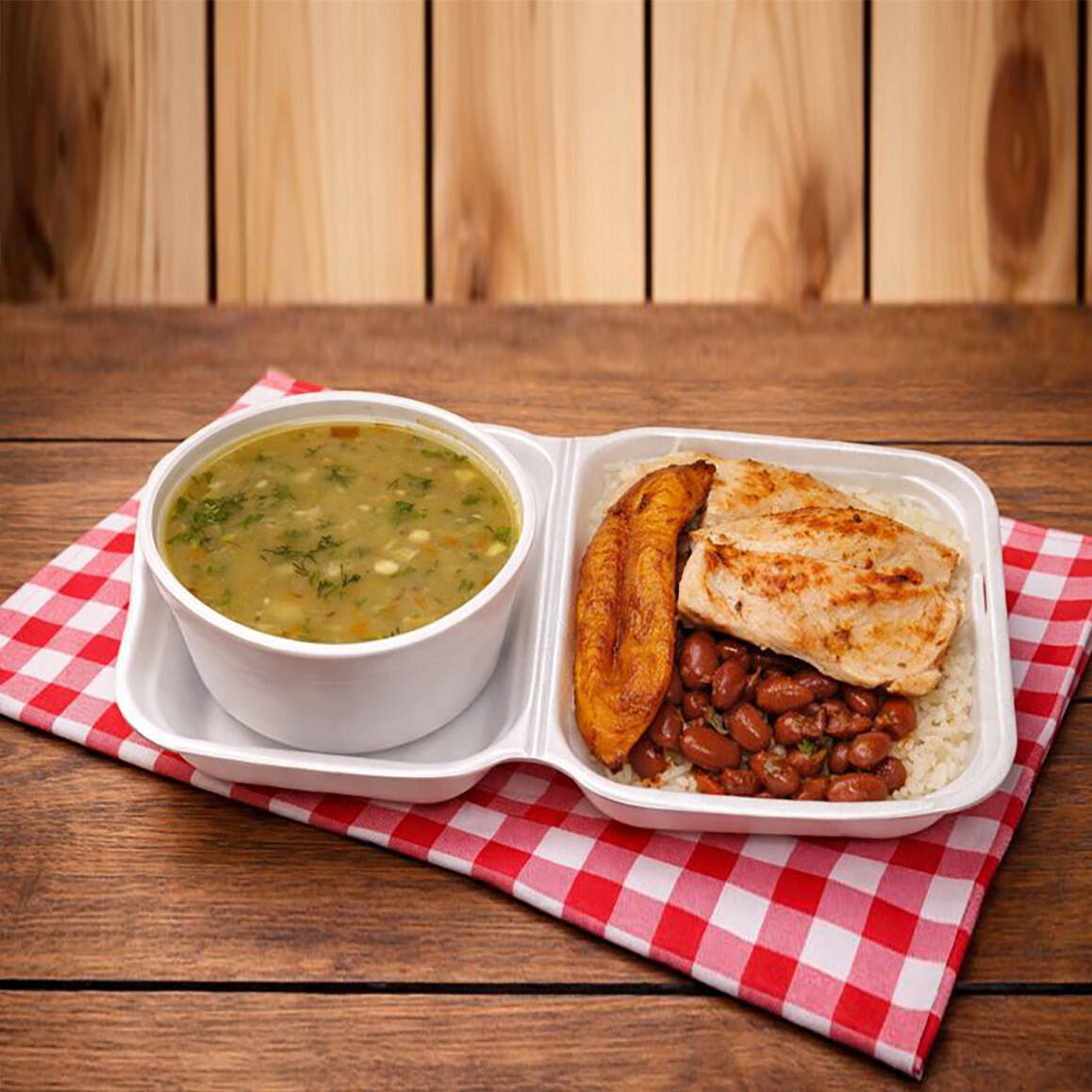 Incluye arroz, granos y pechuga, servido en porta hamburguesa. Acompañado de sopa de 16 oz.