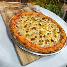 Masa delgada 30 cm, base salsa pomodoro artesanal, queso mozzarella, maíz dulce desgranado y pollo desmechado en crema blanca.