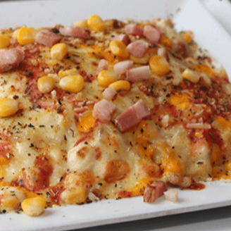 Masa delgada 30 cm, base salsa pomodoro artesanal, queso mozzarella, tocineta ahumada y maíz dulce desgranado.