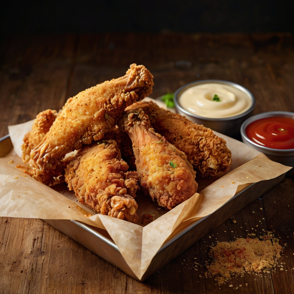 6 Piezas de alitas de pollo crocantes, papas francesas y salsa de la casa golf (receta propia).