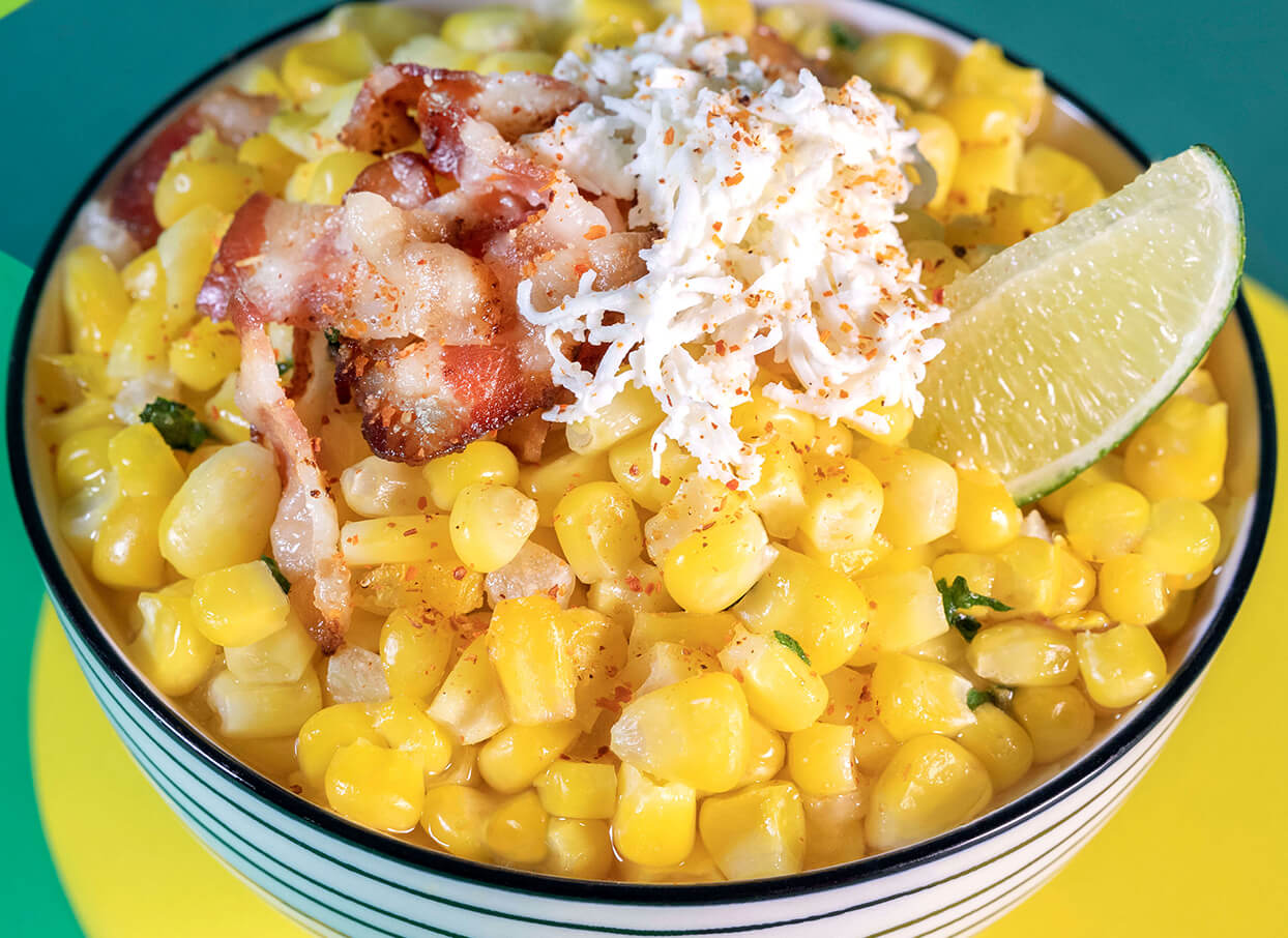 Maíz dulce con queso costeño, tocineta crocante, limón y cilantro.