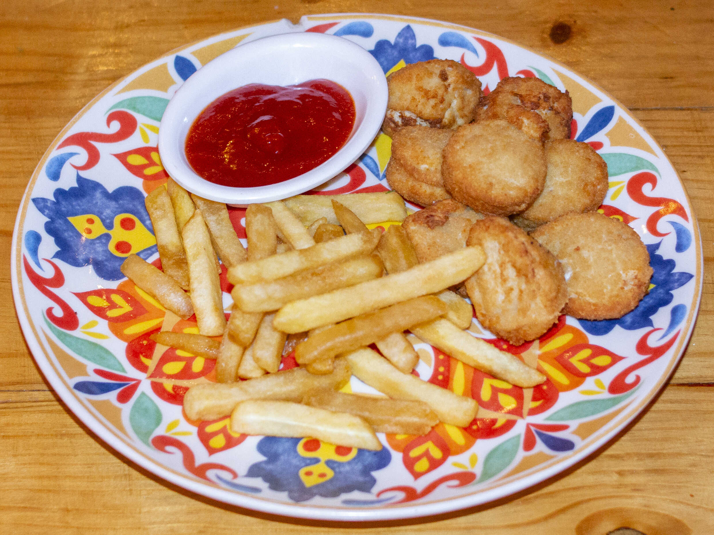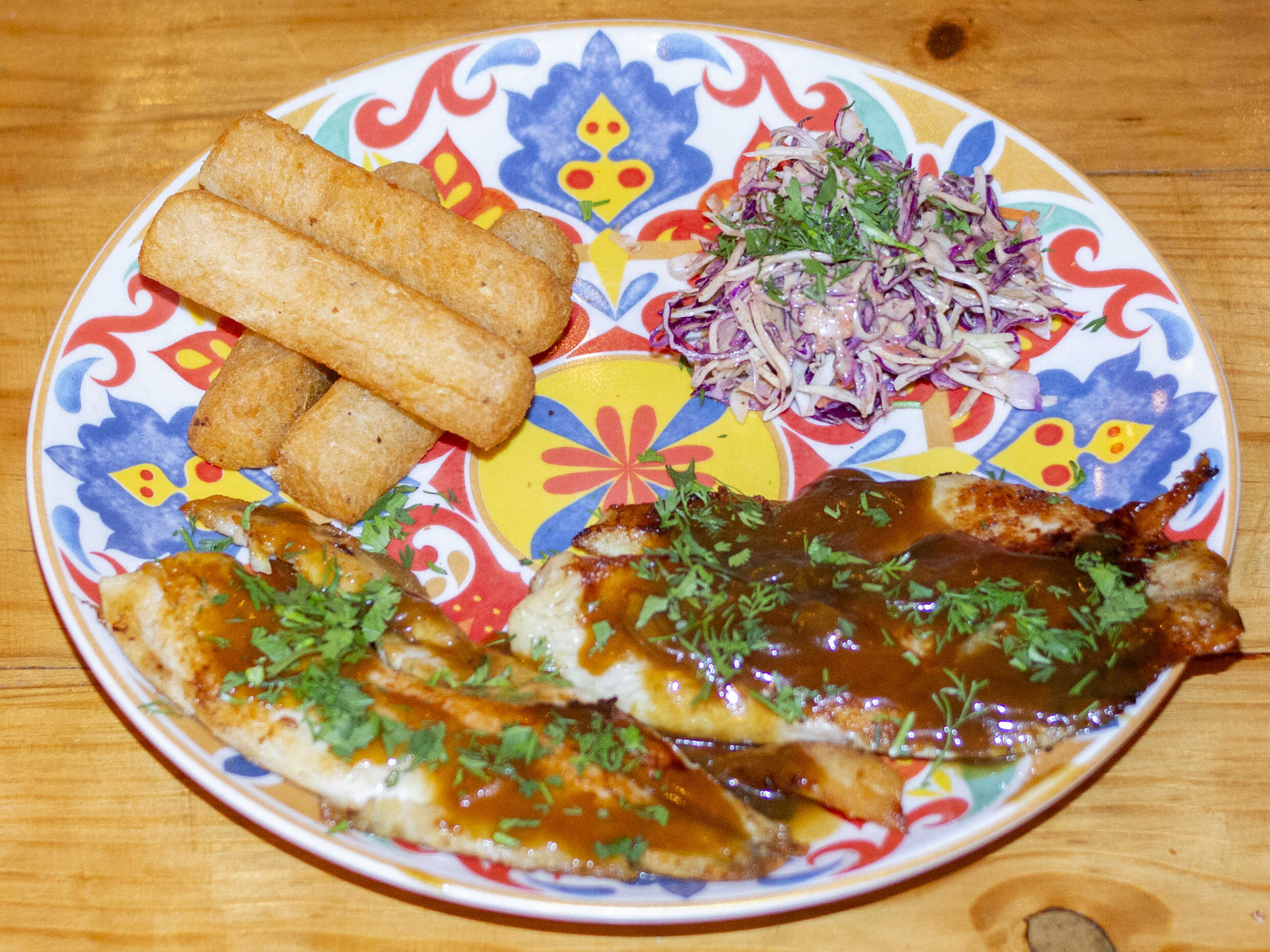 Tortilla, cama de guacamole, pollo crocante, salsa de tamarindo y colleslaw.