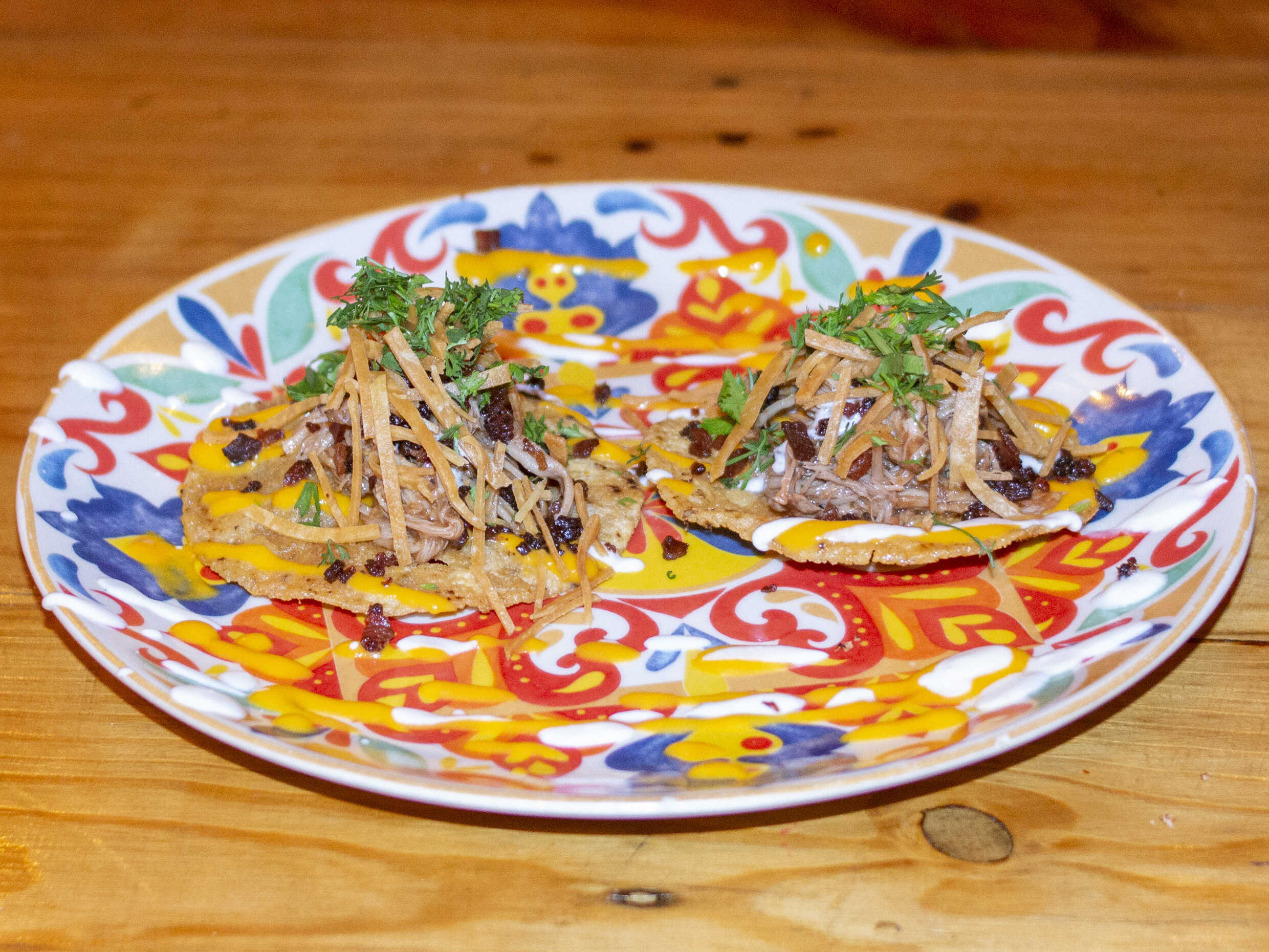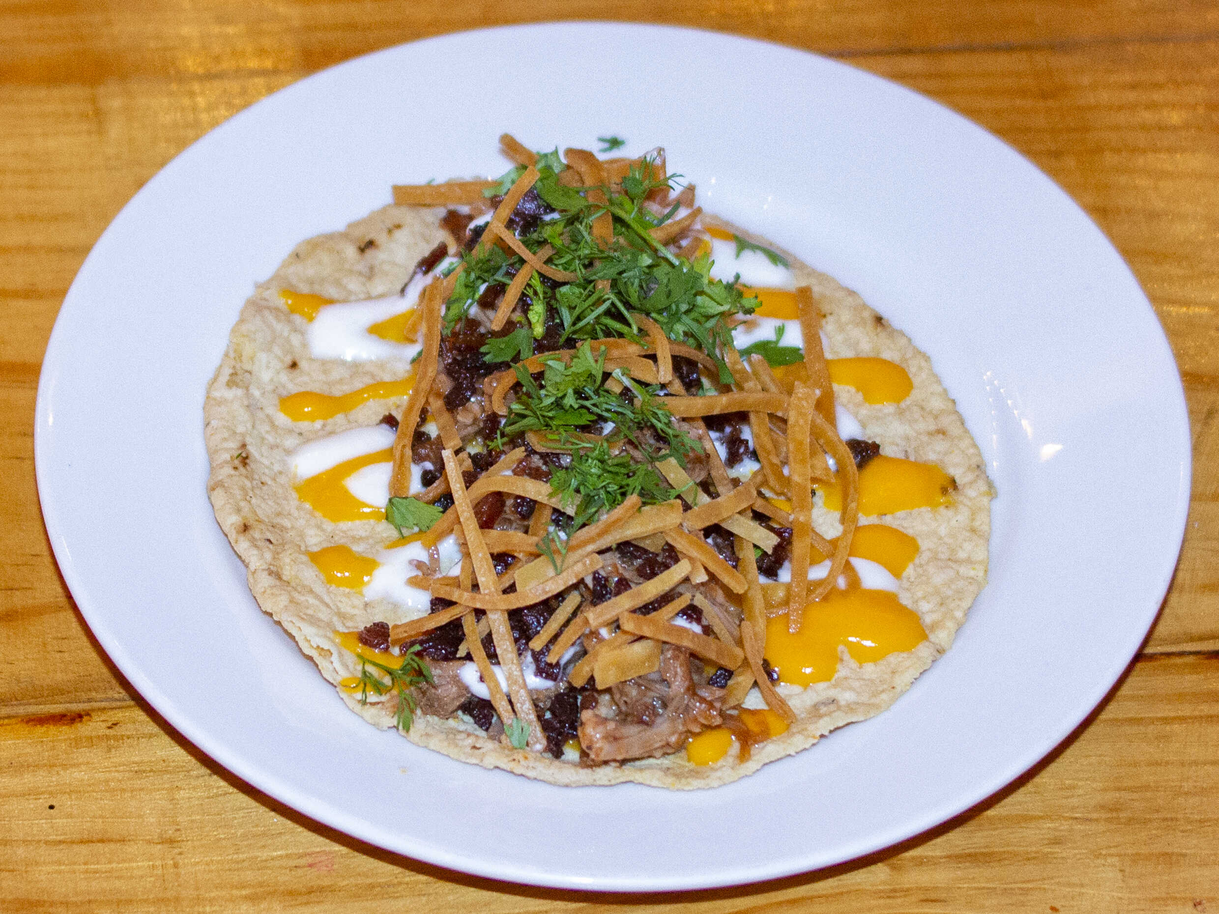 Tortilla, salsa de camote, carnita BBq, sour cream, tortilla frita y cilantro.