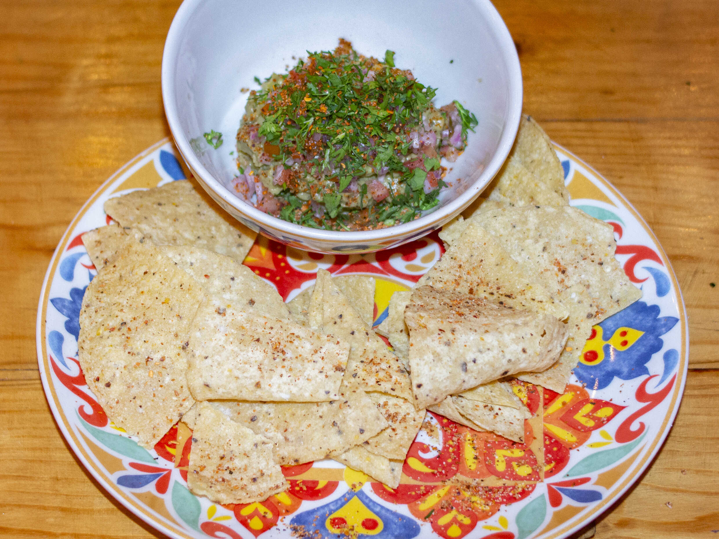 Cremoso aguacate con jalapeño, cebolla roja, cilantro y cítricos, acompañados de nachos.
