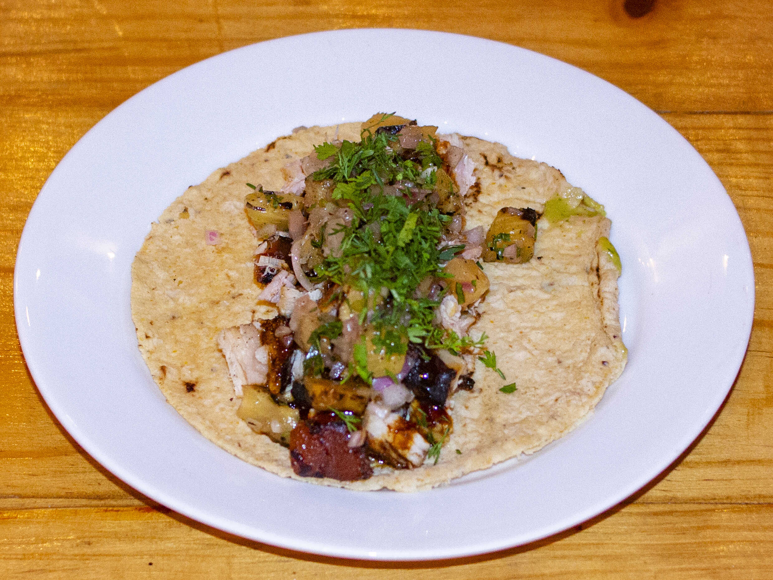 Tortilla, cubos tiernos de porkbelly, salsa de la casa, pico e gallo de piña.
