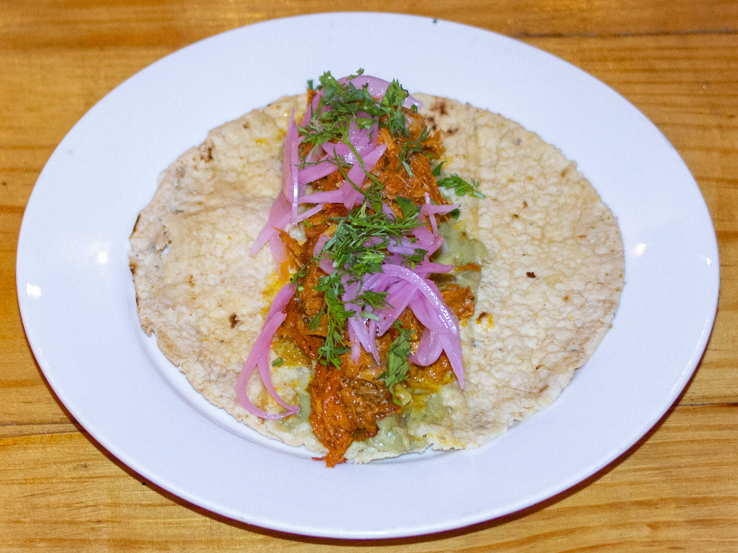 Tortilla, cremoso aguacate, cochinita, cebolla encurtida y cilantro.