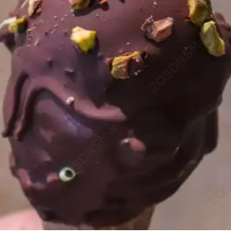 Cono con gelato sabor a pistacchio con cobertura de chocolate.