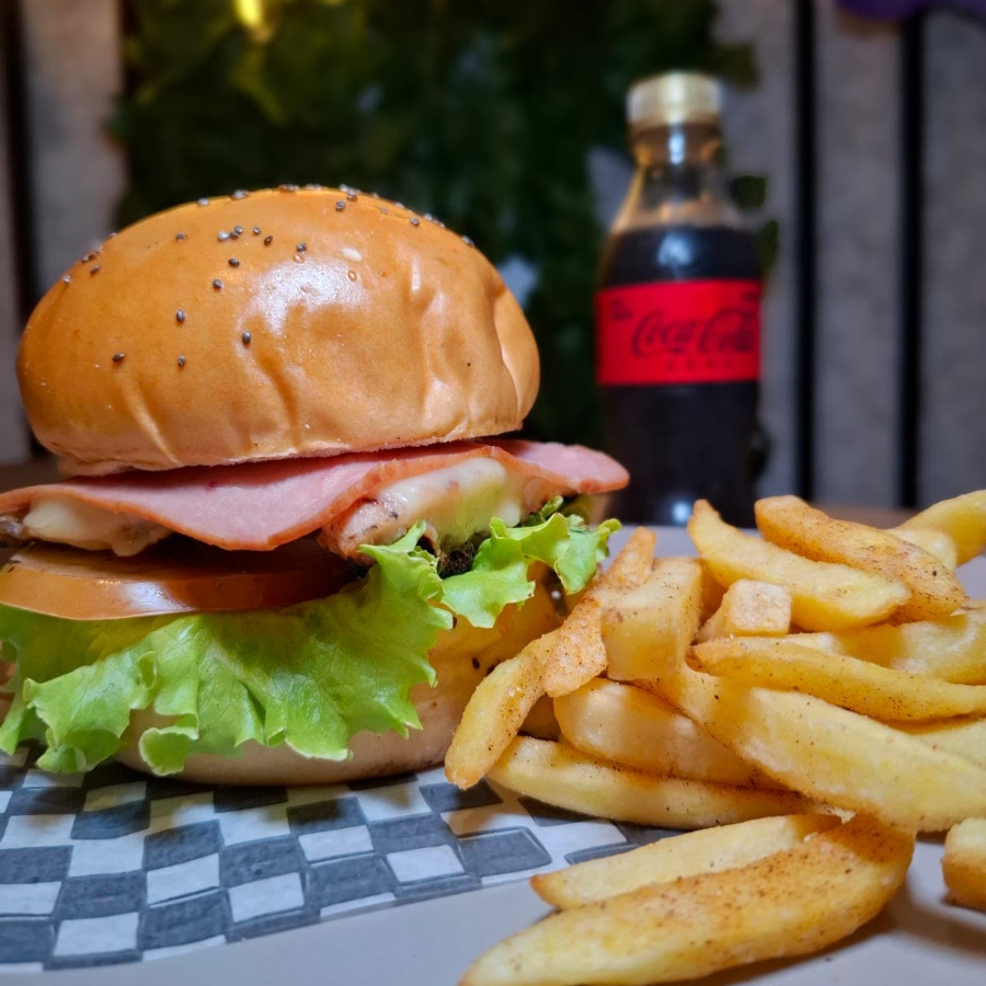 Hamburguesa con 150gr de carnes premium, pan brioche, vegetales frescos, queso costeño, queso cheedar, chorizo antioqueño en reducción de cocacola y salsa de pimentones ahumados con papas y coca cola 250ml.