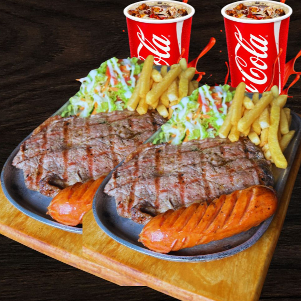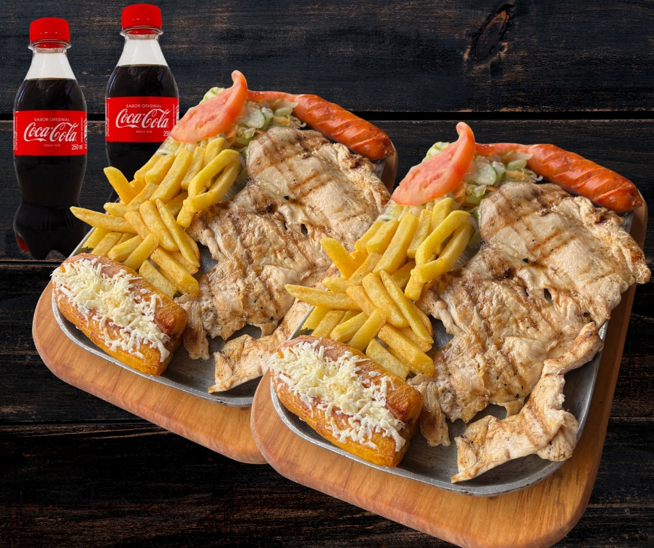 Dos parrilladas de asado mixto que incluyen 100gr de pechuga a la parilla, acompañado de 1 chorizo artesanal, 150gr de papas a la francesa, ensalada de la casa, madurito con queso costeño y 2 coca colas 250ml.