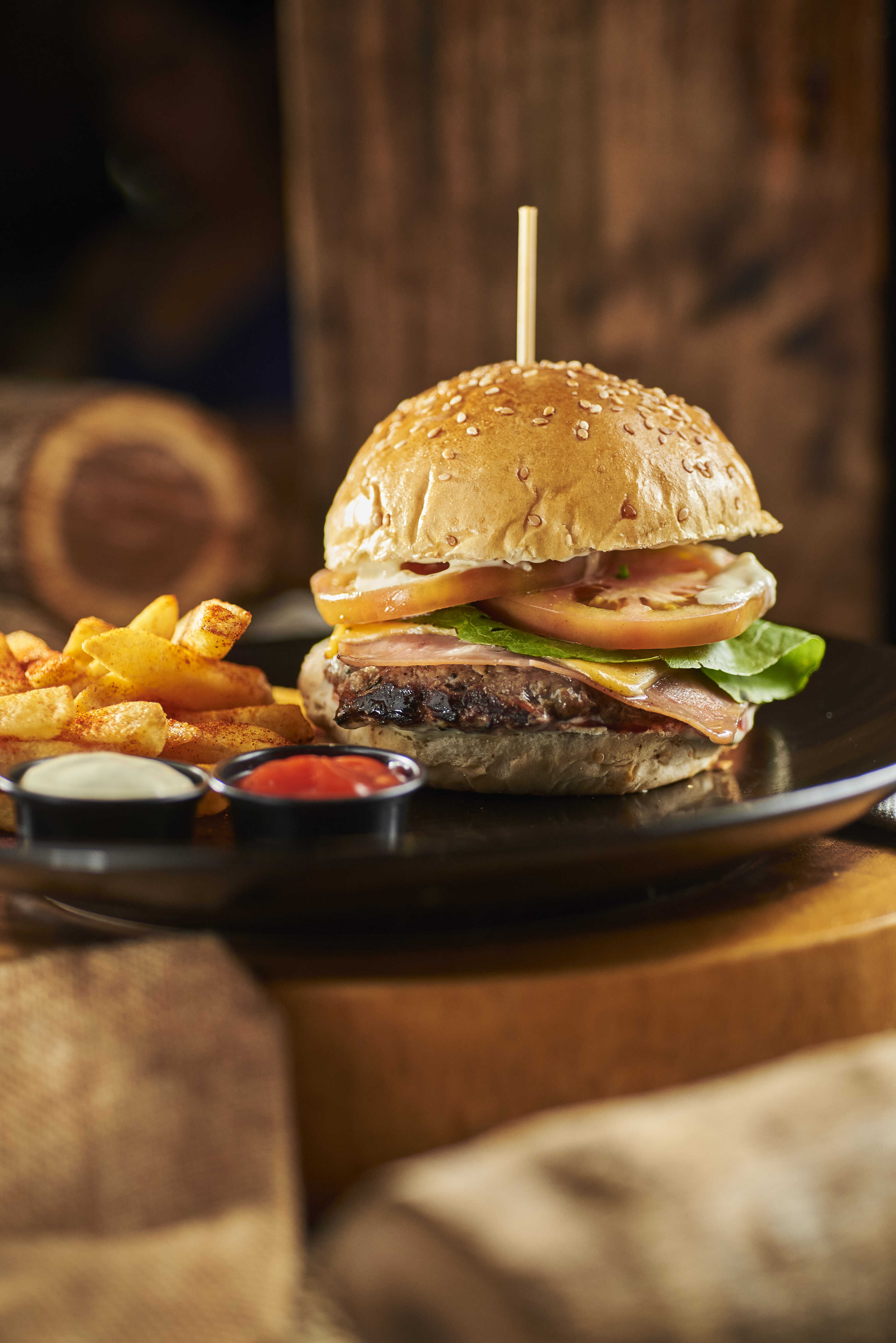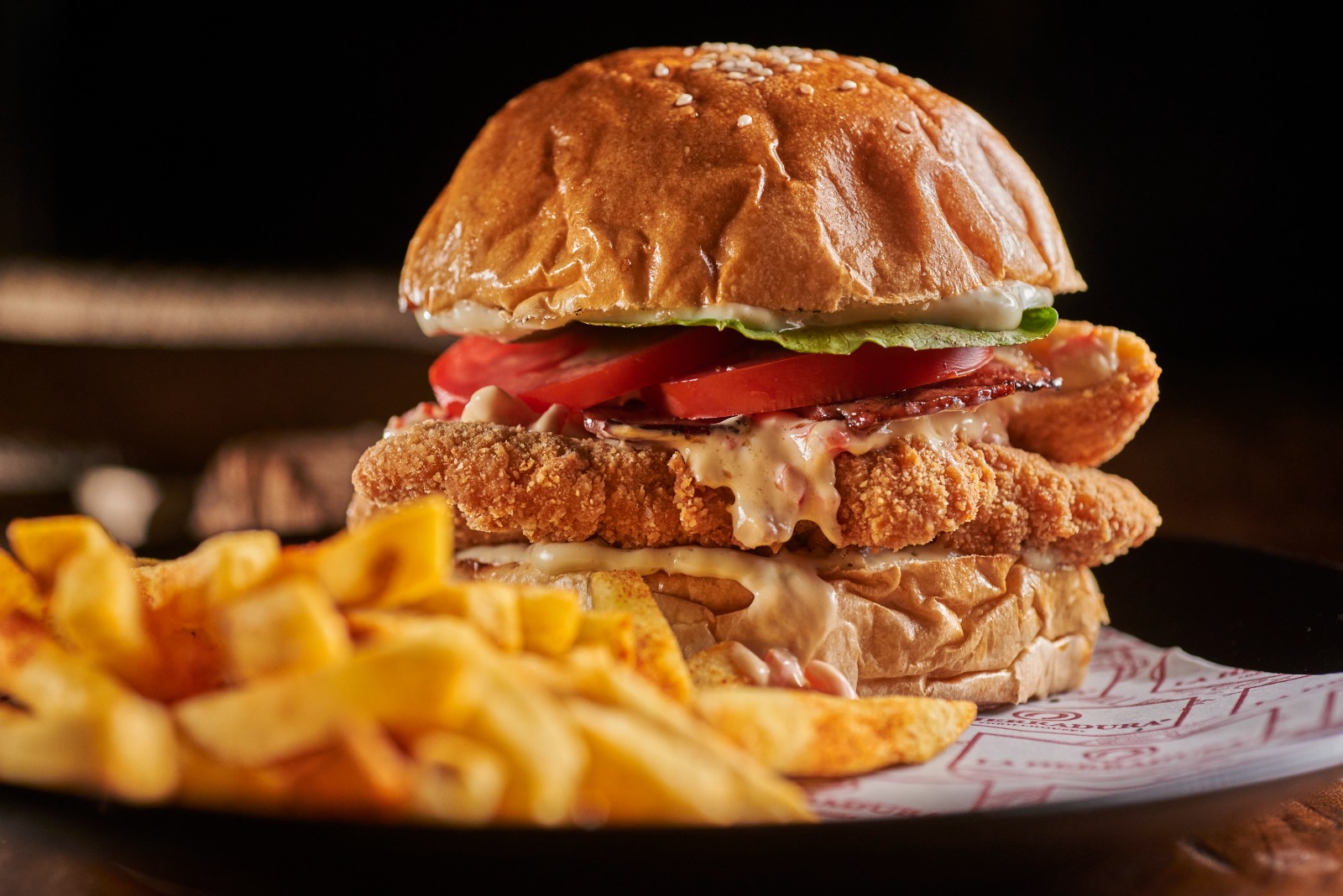 Pan brioche, filete de pechuga asada, queso mozzarela, jamon, vegetales frescos, tartara, porcion de papas a la francesa.