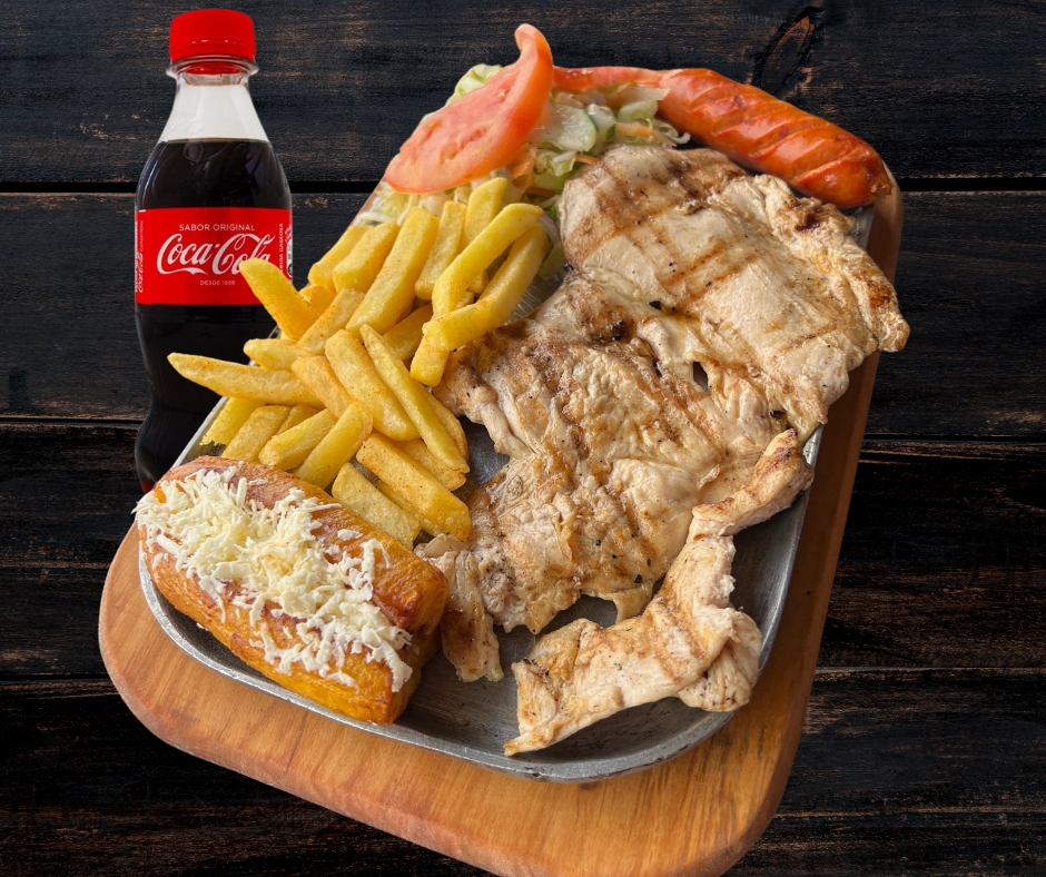 Parrillada de asado mixto con 100gr de pechuga a la parilla acompañado de 1 chorizo artesanal, 150gr de papas a la francesa, ensalada de la casa, madurito con queso costeño y coca cola 250ml