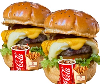 Dos hamburguesas con 150gr de carne premiun, pan brioche, vegetales frescos, queso costeño, queso cheedar, chorizo antioqueño en reducción de cocacola y salsa de pimentones ahumados con 2 gaseosas coca cola 250ml y papas a la francesa.