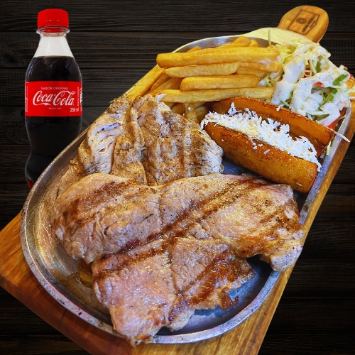 Parrillada con 100gr de pechuga, 100gr de lomo de cerdo acompañada de papas a la francesa, madurito con queso costeño, ensalada de la casa y coca cola 250m