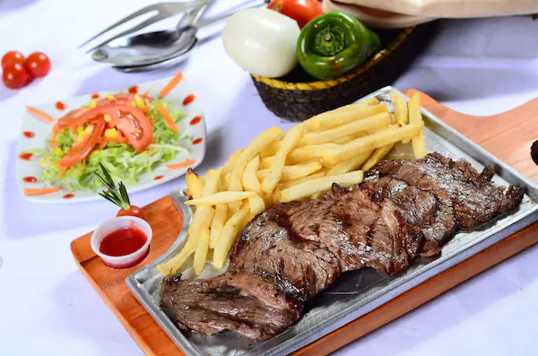 250 Gr de carne punta gorda con acompañamiento a elegir (yuca, papas al vapor o porcion de papas a la francesa) y ensalada de la casa.