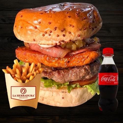 Hamburguesa con 150gr de carnes premium, pan brioche, vegetales frescos, queso costeño, queso cheedar, chorizo antioqueño en reducción de cocacola y salsa de pimentones ahumados con papas y coca cola 250ml.