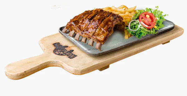 600 Gramos de costillas bbq, acompañado con papas a la francesa y ensalada de la casa.