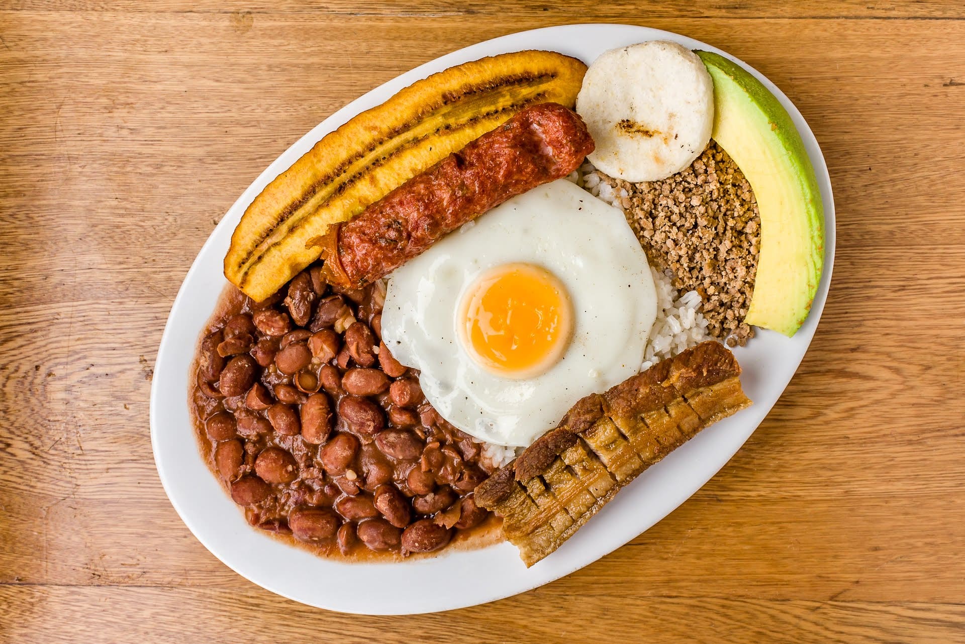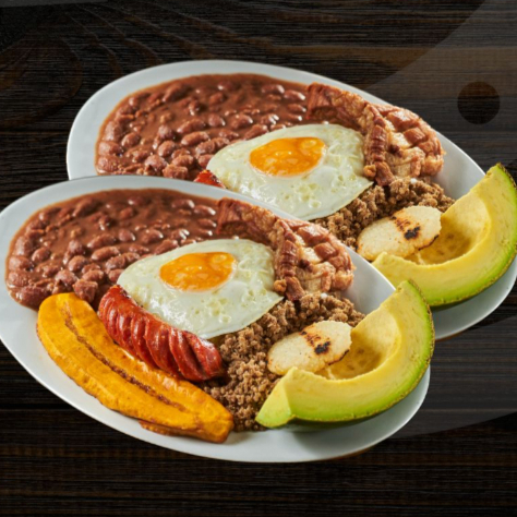 Frijol, arroz, chicharrón, carne molida, chorizo, aguacate, huevo, tajada