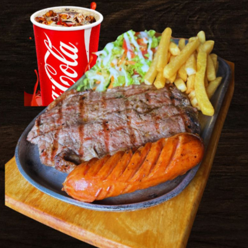 100Gr de churrasco, 100gr de lomo de cerdo, 100gr de pechuga, chorizo artesanal, ensalada de la casa, papas a la francesa y coca cola 250ml.