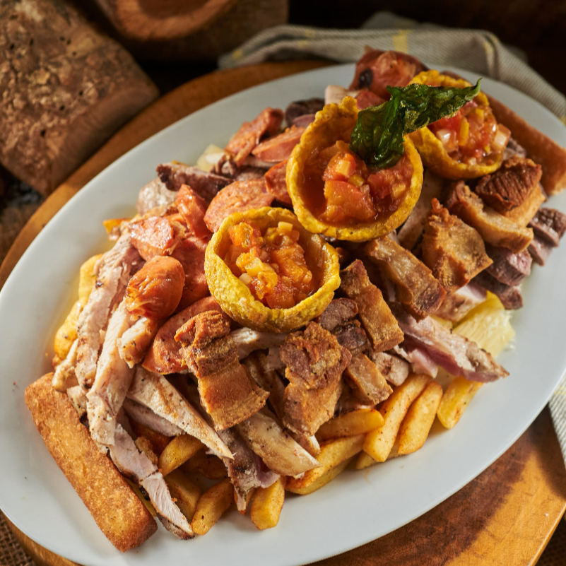 Combinacion de punta gorda, pechuga, lomo de cerdo, chorizo y chicharron, acompañado de papas a la francesa, y canasticas de patacon con hogao, croquetas de yuca y ensalada, ideal para 3 personas.
