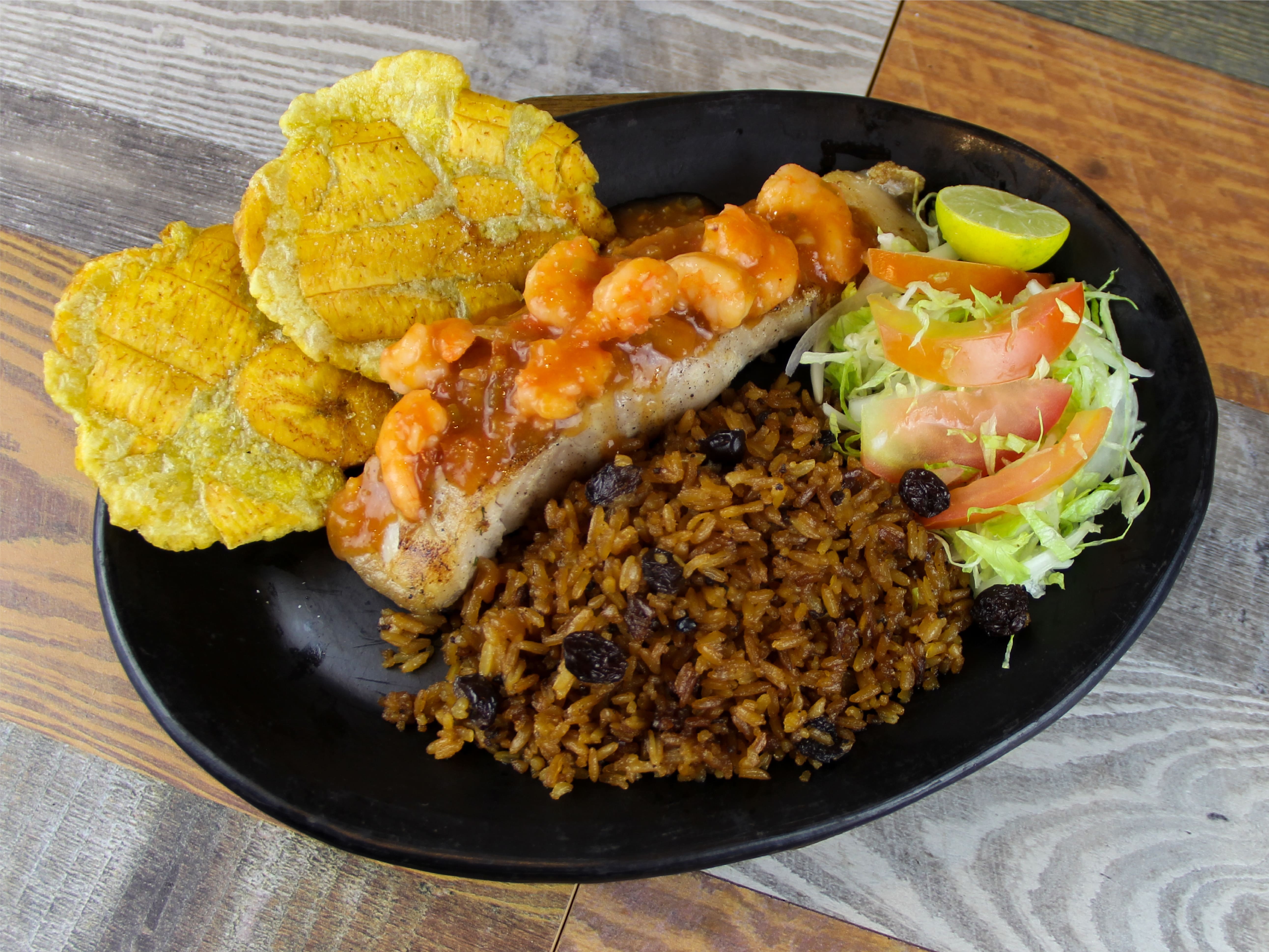 Filete de robalo en salsa criolla con camarones, arroz con coco, patacones y ensalada de la casa.