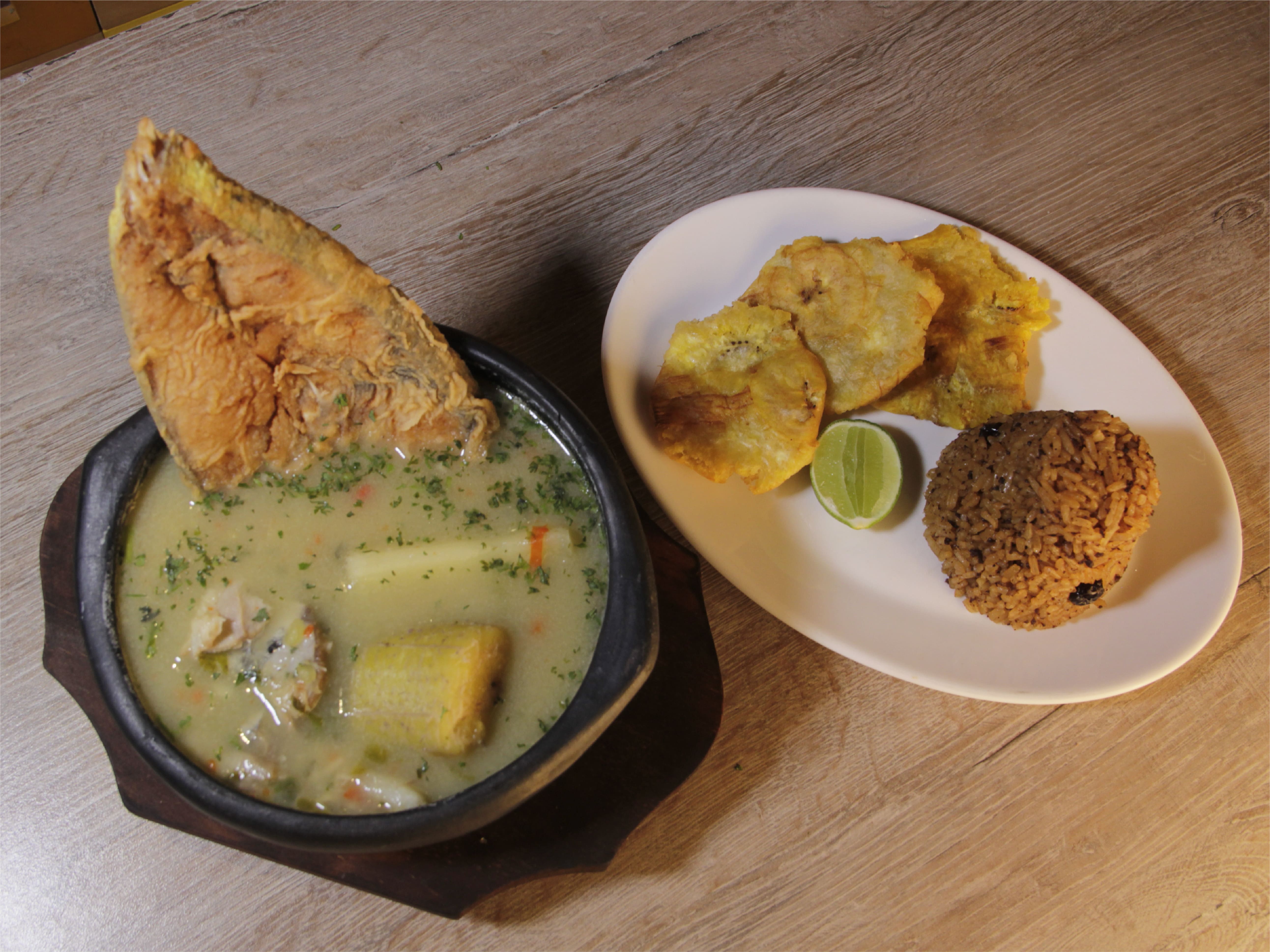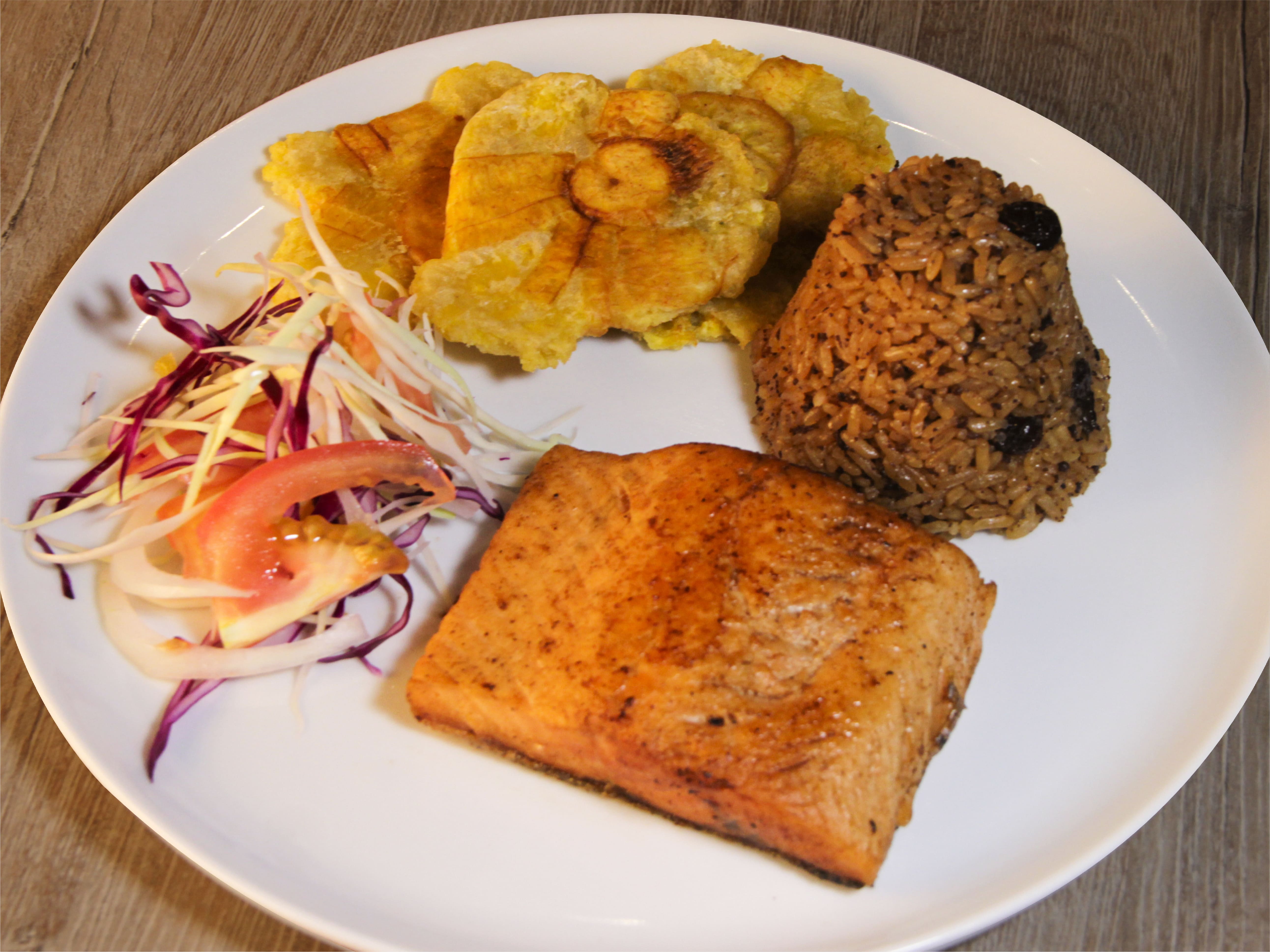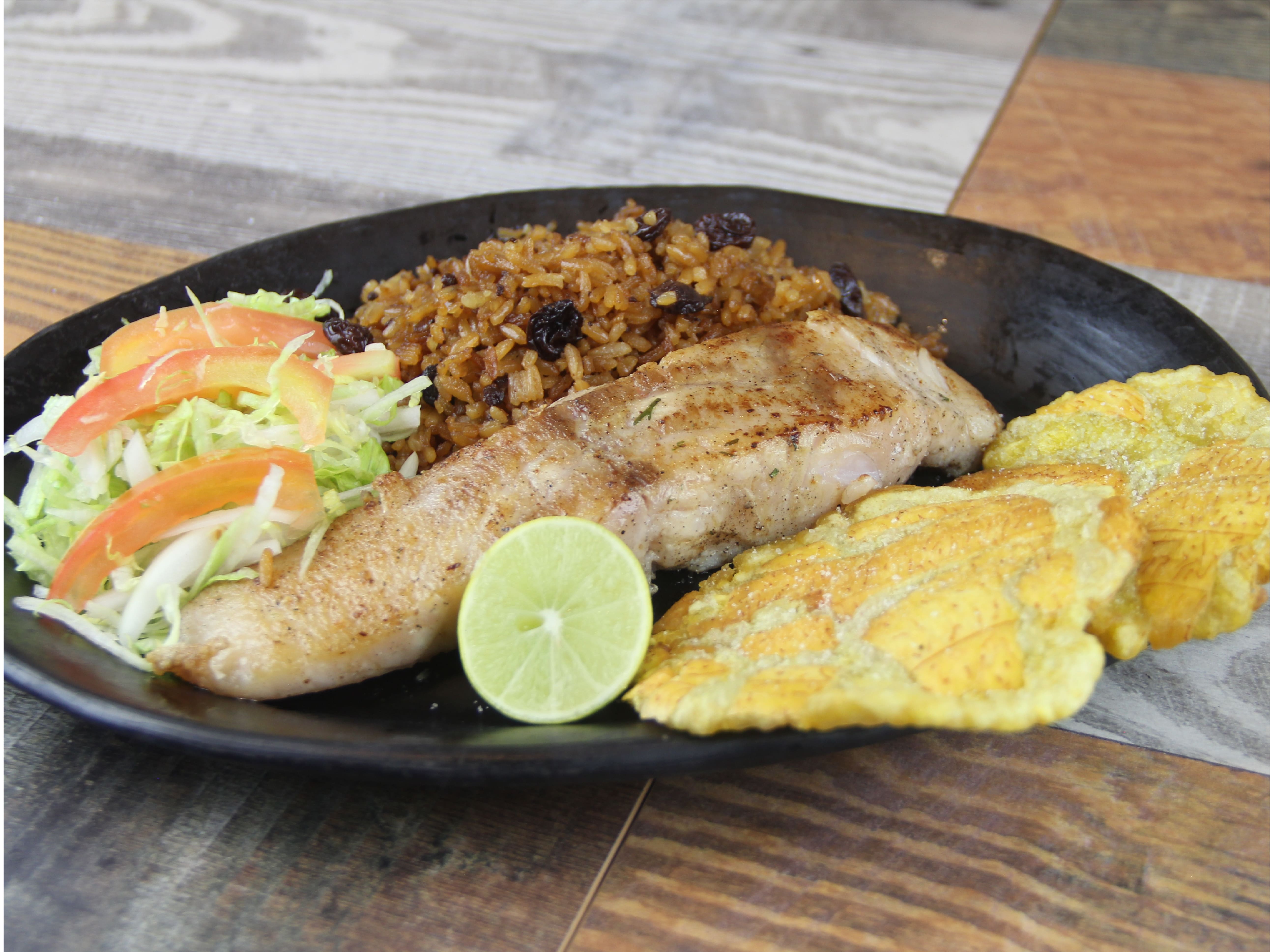 Acompañado de verduras grille, arroz de coco y patacones.
