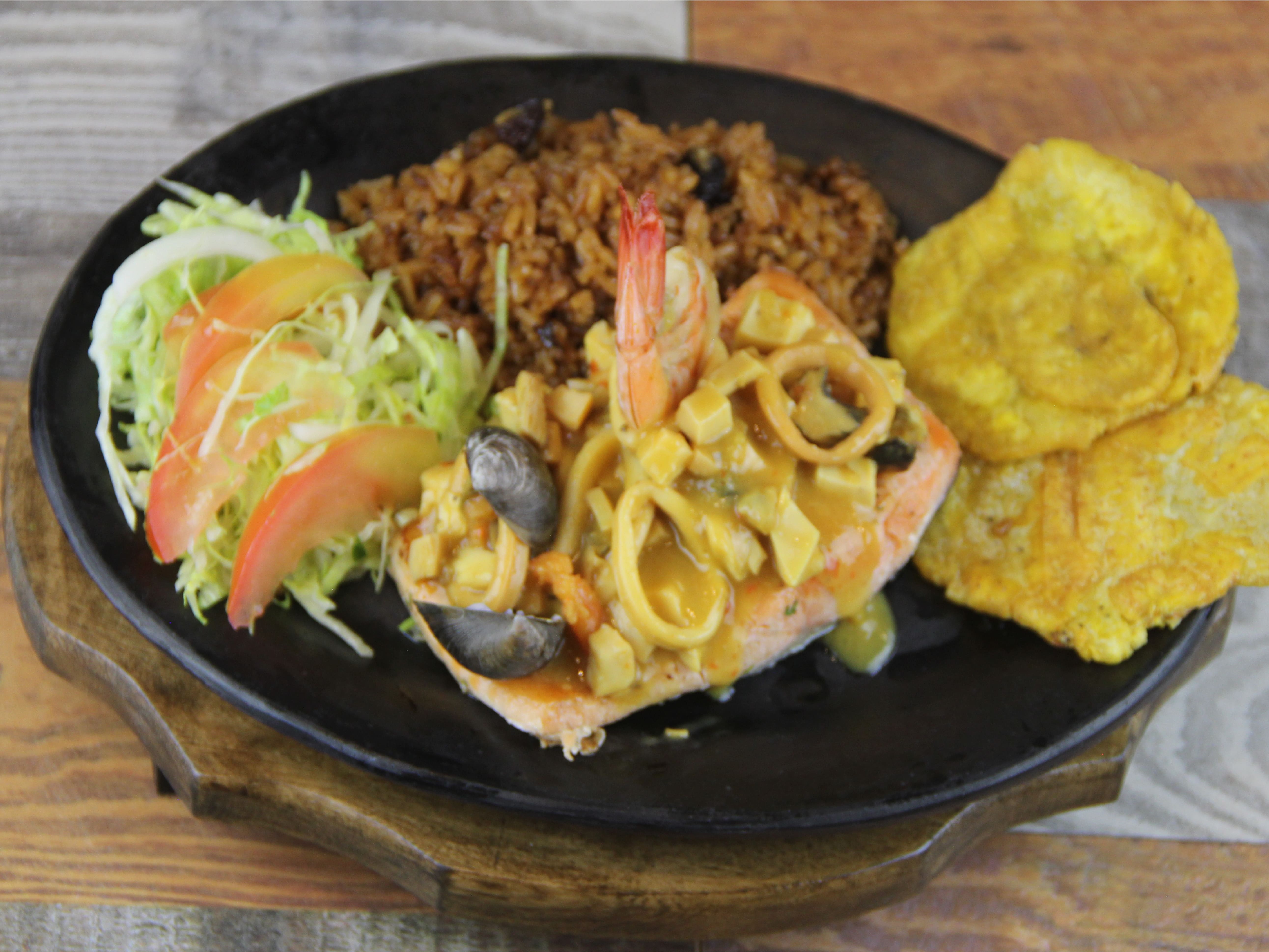 Camarón, calamar y almejas con arroz criollo con verduras, acompañado con patacones.