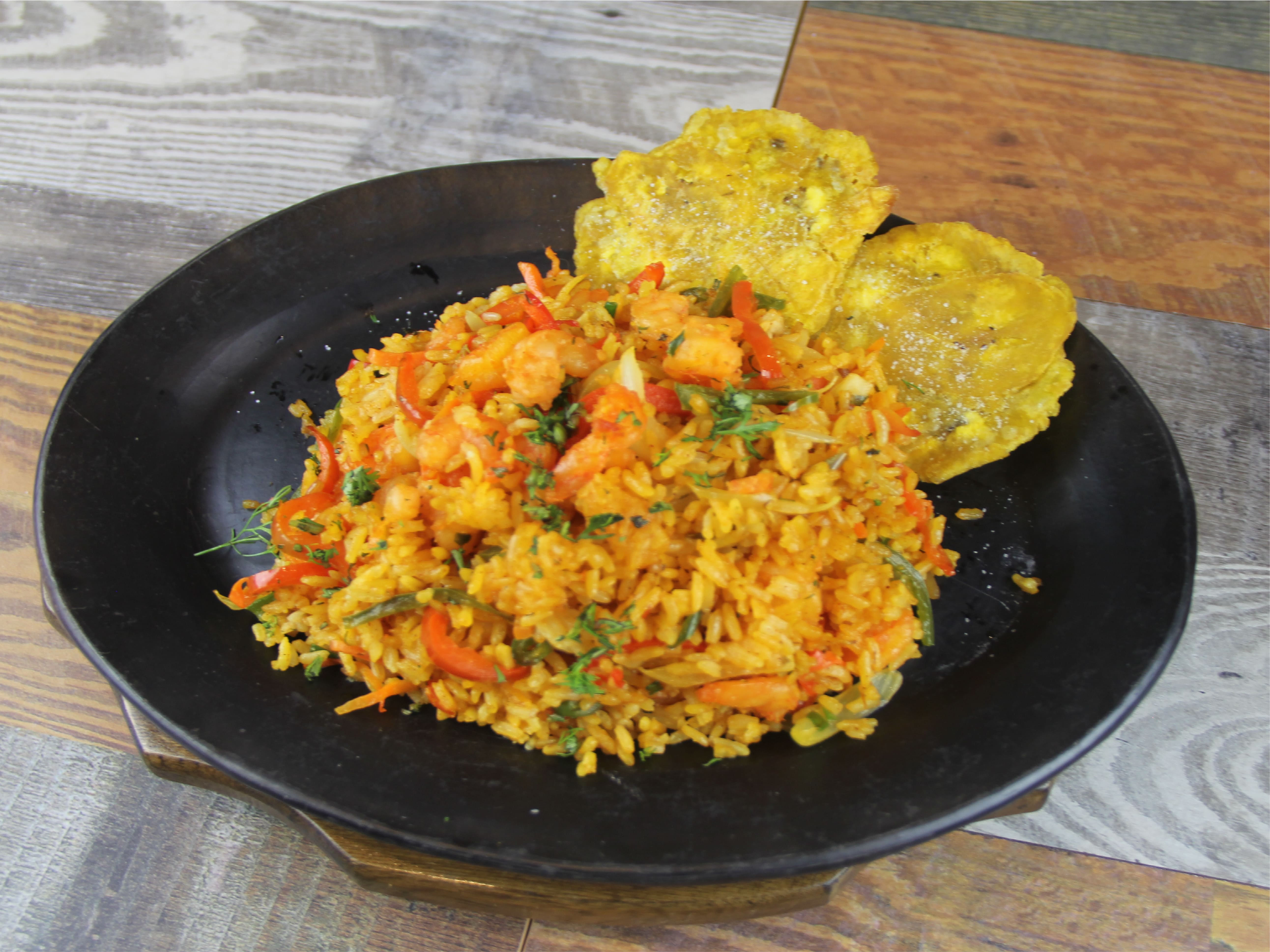 Camarones salteados mezclados con arroz criollo y verduras, acompañado de patacones.