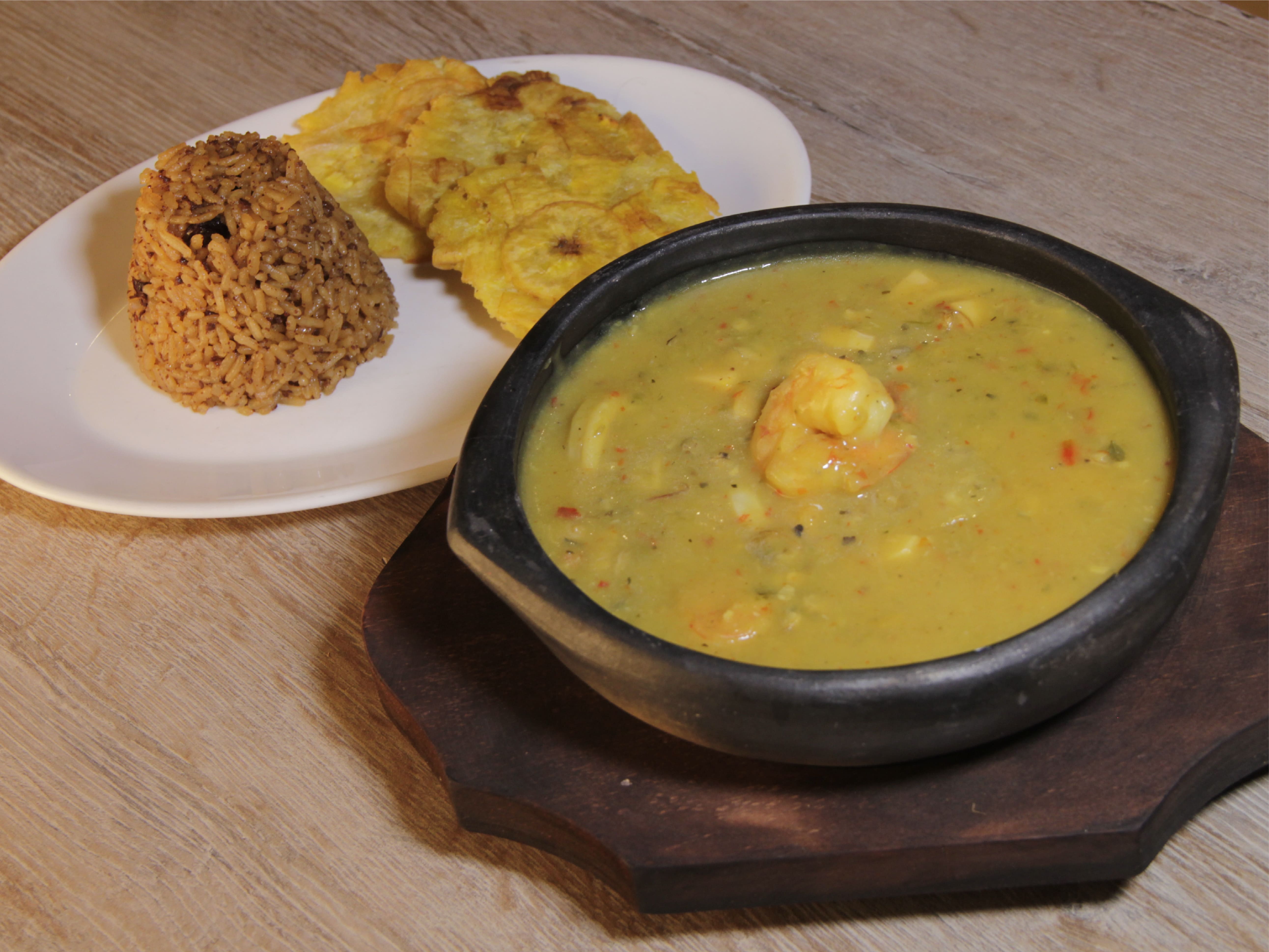 Caldo especiado con camarones, calamar, pulpo, almejas, caracol y langostinos, acompañado con arroz de coco y patacón.